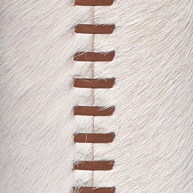 Warm oil rubbed bronze is wrapped in white hair-on hide in this exceptional lighting option. The hides for each are selected by hand; no two hides will be identical. Their masculine edge is enhanced with a bronze finial and softened with an off-white linen drum shade, resulting in a unique choice for study, living area, or den.