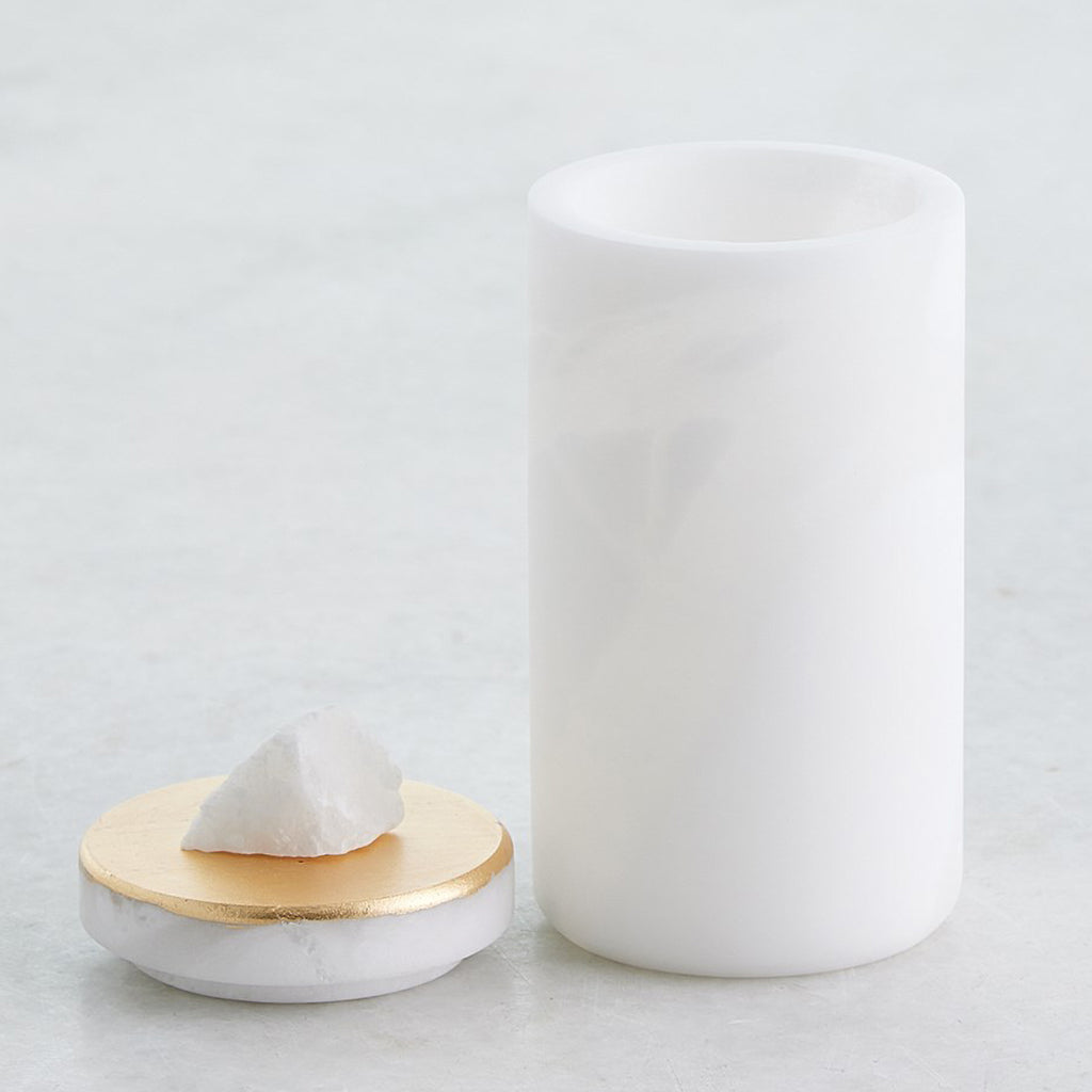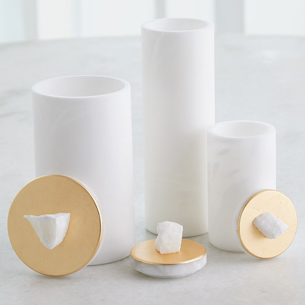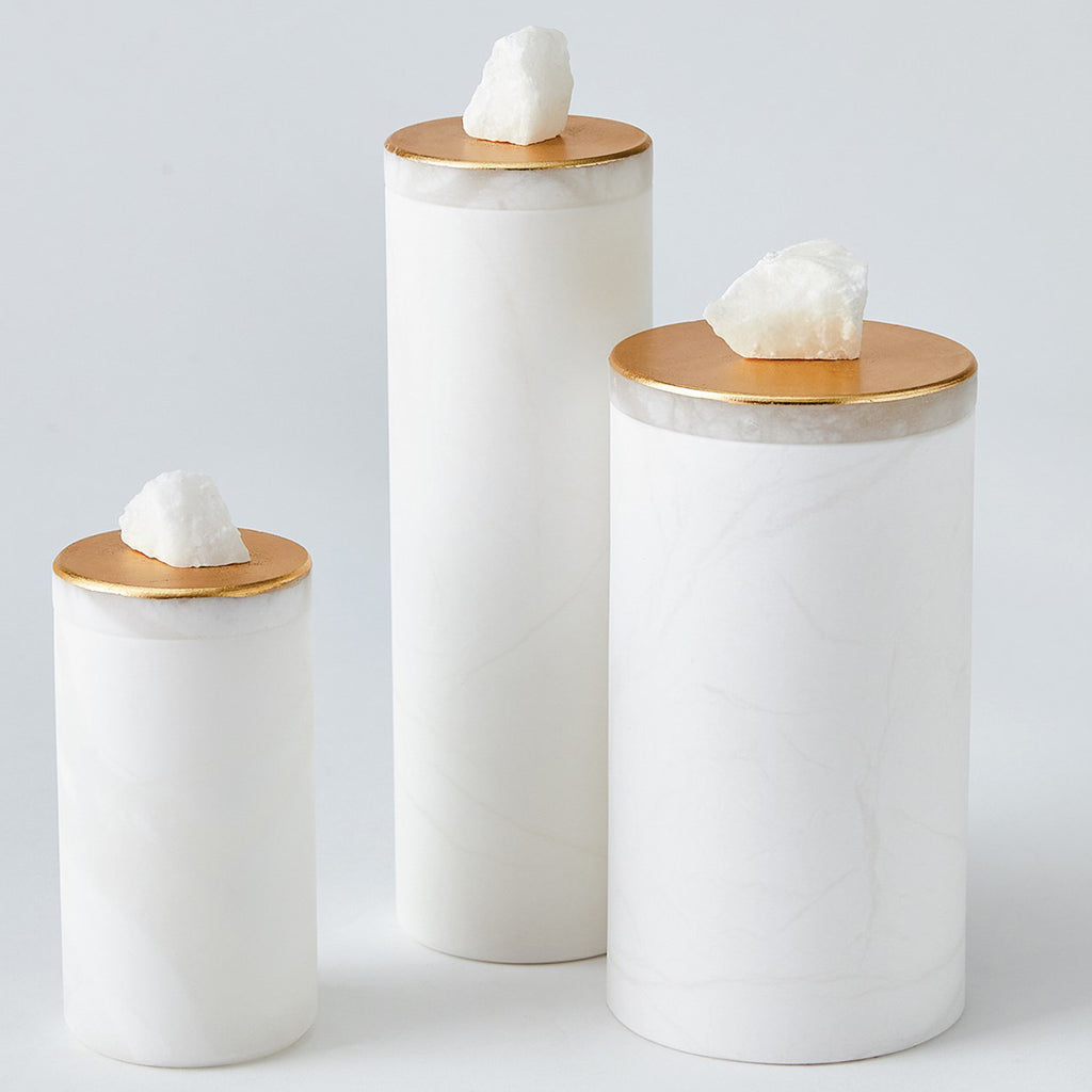 The Quarry Jars are expertly carved from Italian alabaster, highlighting the stone's intricate details. Each jar lid is adorned with hand-painted gold leaf accents and a raw-edge stone, adding an elegant touch to your décor. As alabaster is a natural material, variations in veining and color are to be expected, making each piece uniquely yours.