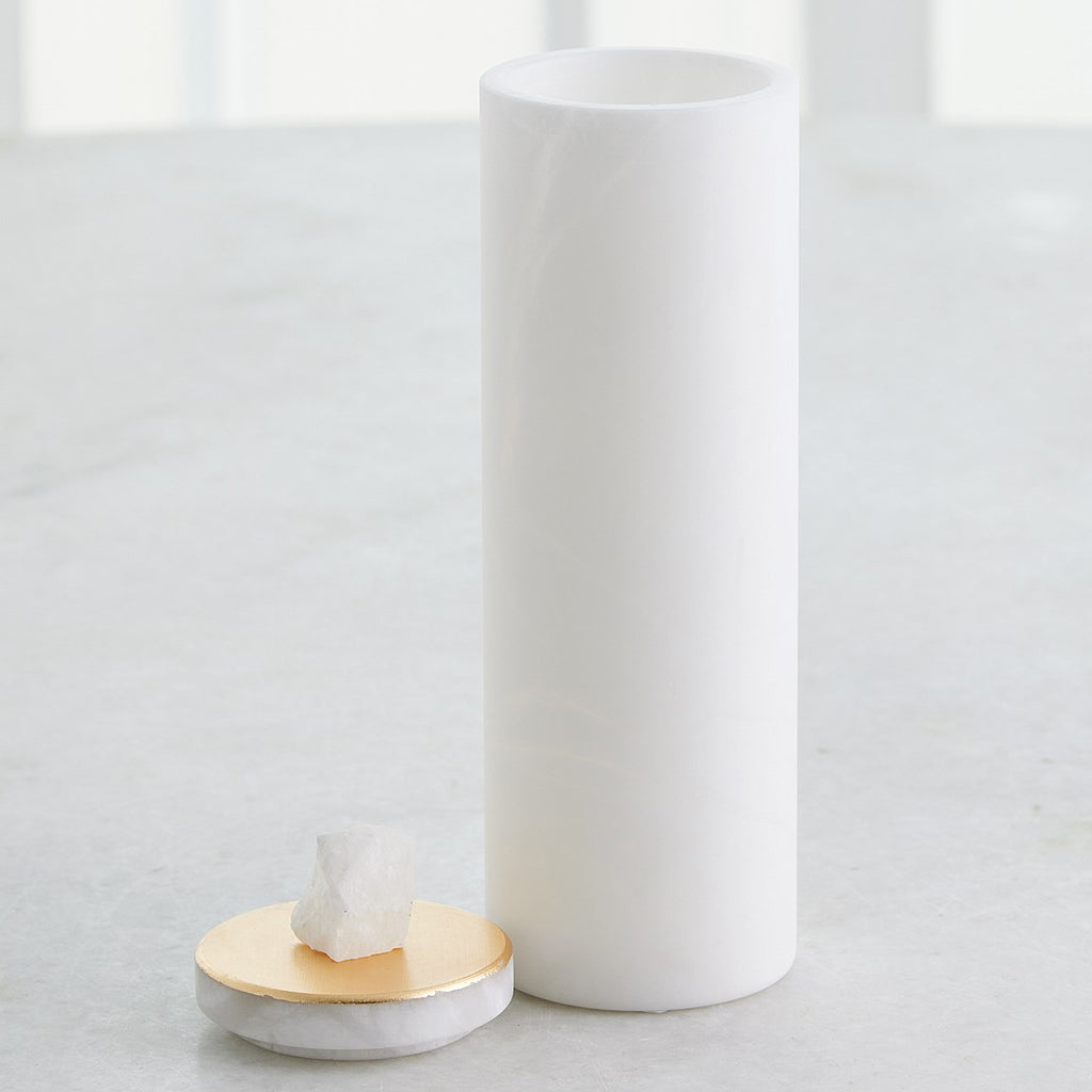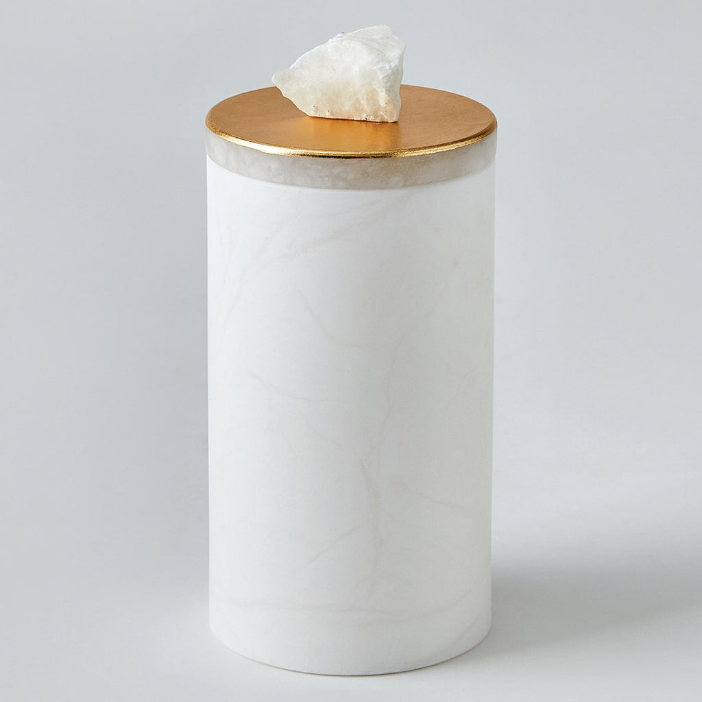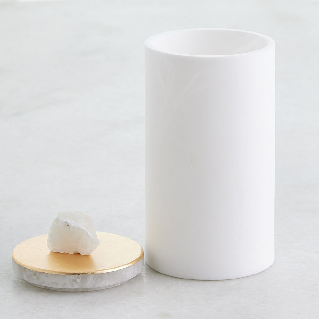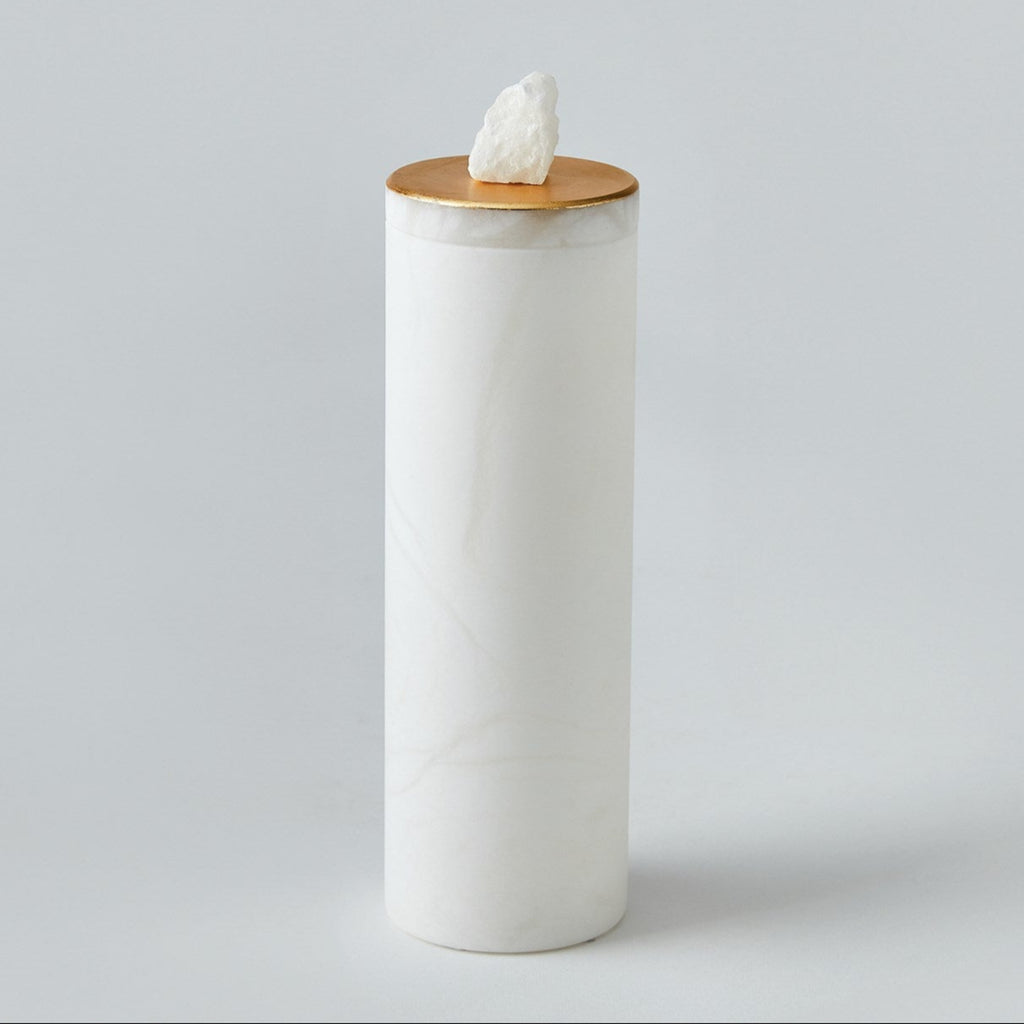 The Quarry Jars are expertly carved from Italian alabaster, highlighting the stone's intricate details. Each jar lid is adorned with hand-painted gold leaf accents and a raw-edge stone, adding an elegant touch to your décor. As alabaster is a natural material, variations in veining and color are to be expected, making each piece uniquely yours.