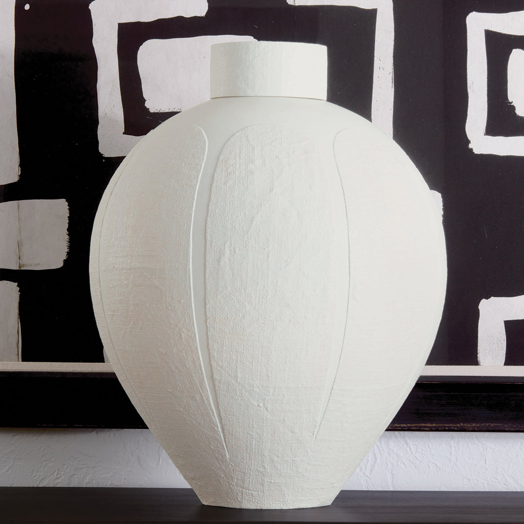 The Studio A Linen jar is a dense, irregular texture of handwoven linen over a smooth background gives this large-scale, lidded porcelain jar lots of personality.