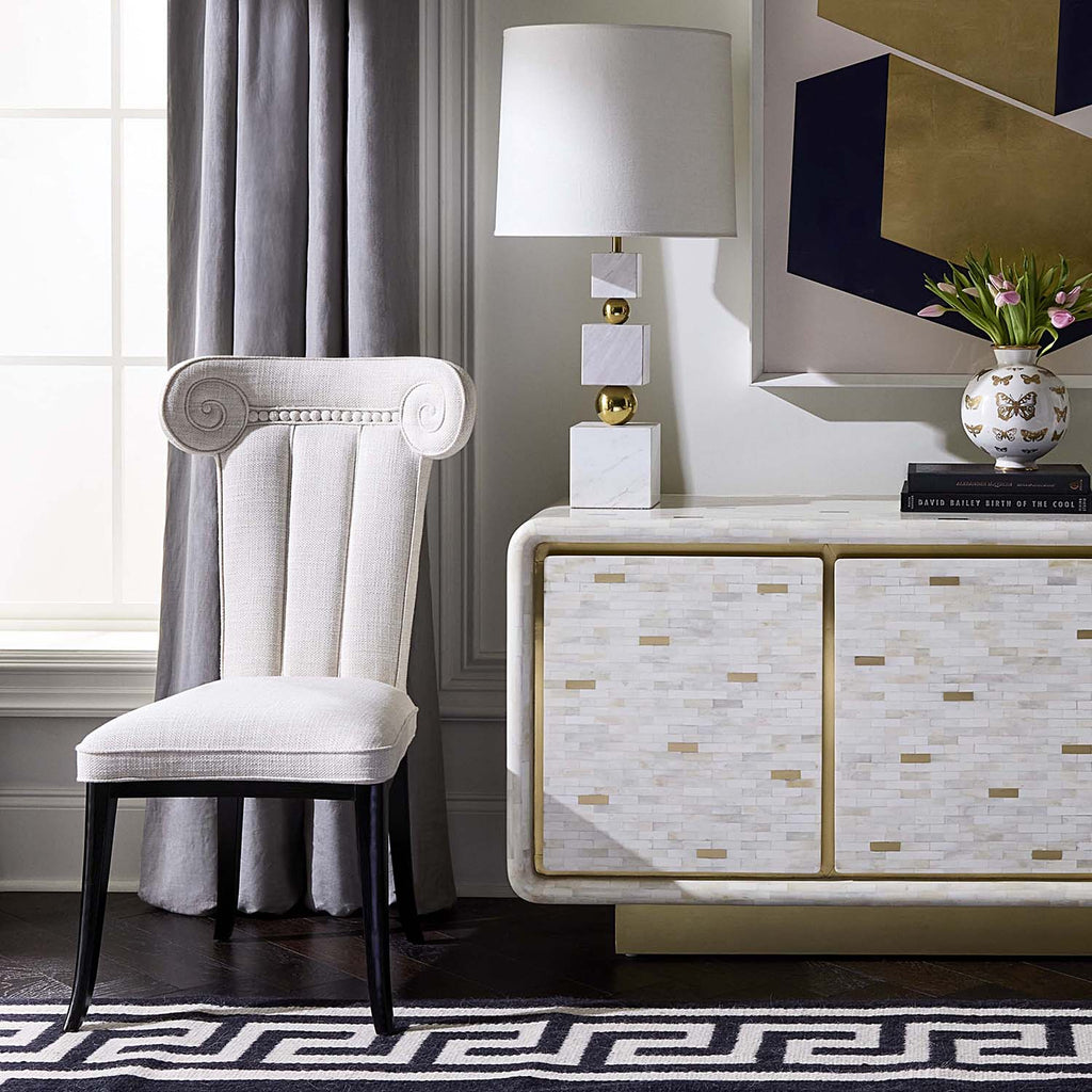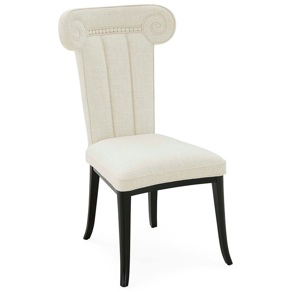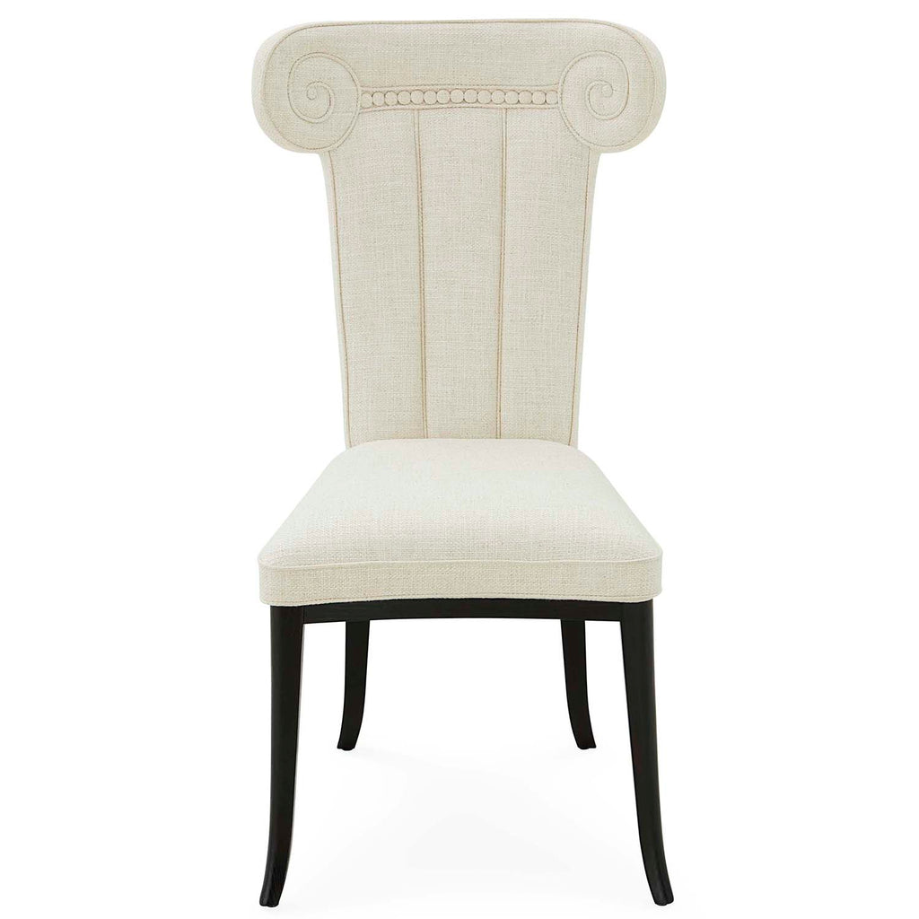 Neoclassical style meets minimalist comfort. Featuring a tall back with button accents and a cradling curve at the top that adds to its sculptural air and a thick comfy seat cushion, our Acropolis Dining Chair stands on ebonized ash wood legs. Perfect for bringing drama to your dining table, a dash of scholarly style to your desk, or double up and let the pair flank a console.