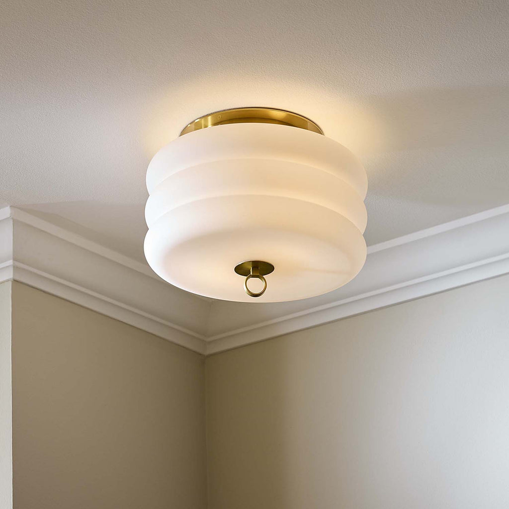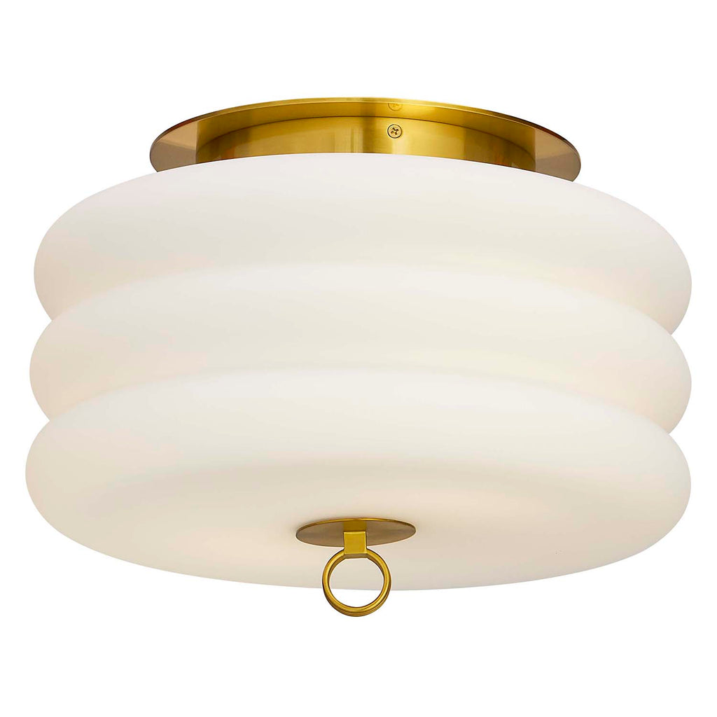 An ultra modernist statement. Our Alphaville Flush Mount features a stacked capsule shaped milk glass shade with a smooth honed brass base and a triple stacked ring finial. Jewelry for your abode by day, a real glow-getter by night. Modernize your Park Avenue penthouse or add traditional elegance to your Tribeca loft.