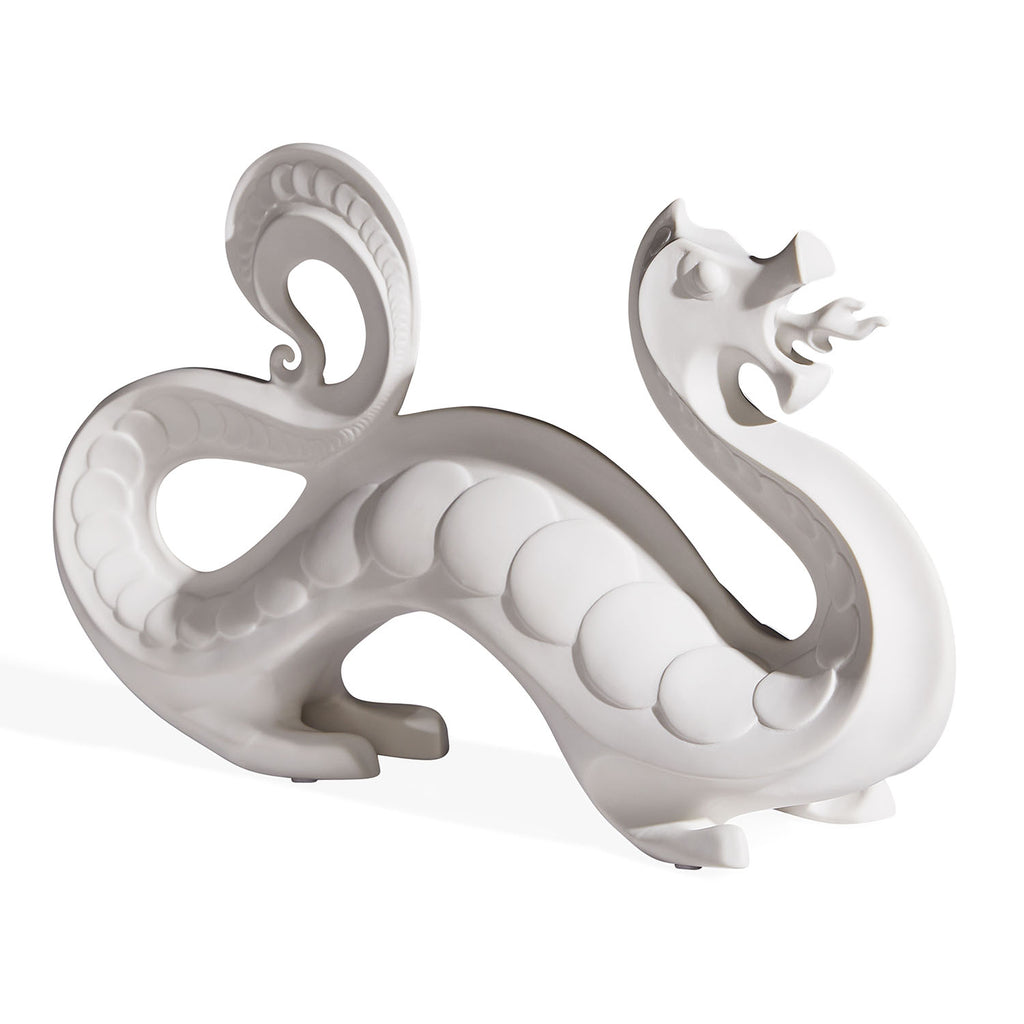 Stop chasing—it's back from the vault. Simplified to its elemental form and decorated with textural layers of bold geometric pattern, our matte porcelain Dragon Objet is a mythical slay. A symbol of everything from power to spirituality and luck to prosperity, this is the dynamic creature your tablescape, shelf, or mantel needs. Sculptural and fierce.