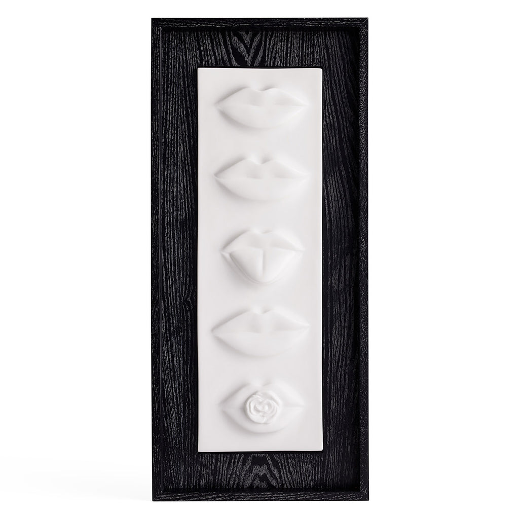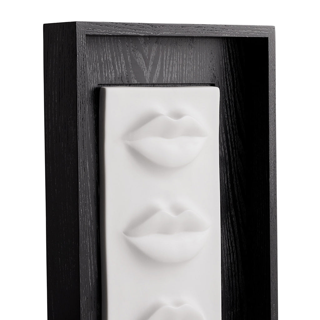 We’ve taken our iconic Muse pottery and reimagined it as sculpture for your walls. High-fired unglazed porcelain highlights our muse’s flawless features in delicate detail. Framed in an ebonized and wire-brushed oak shadow box. Hang it with our Gala Vertical Art for a divinely dimensional wallscape. Jonathan sculpts and throws the models for our Muse porcelain and then substitutes our signature geometric relief patterns with body parts—faces, breasts, lips—to create a surreal style. Pieces are inspired by our favorite artists' muses.