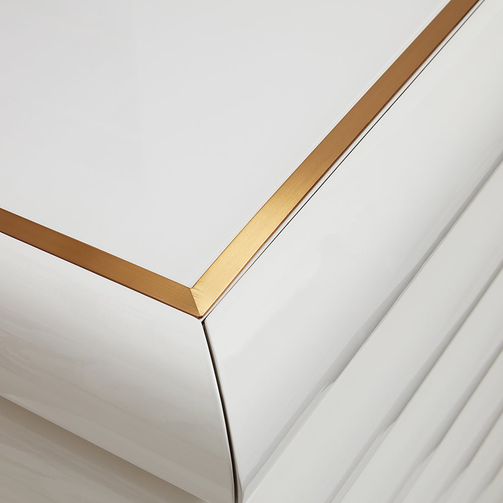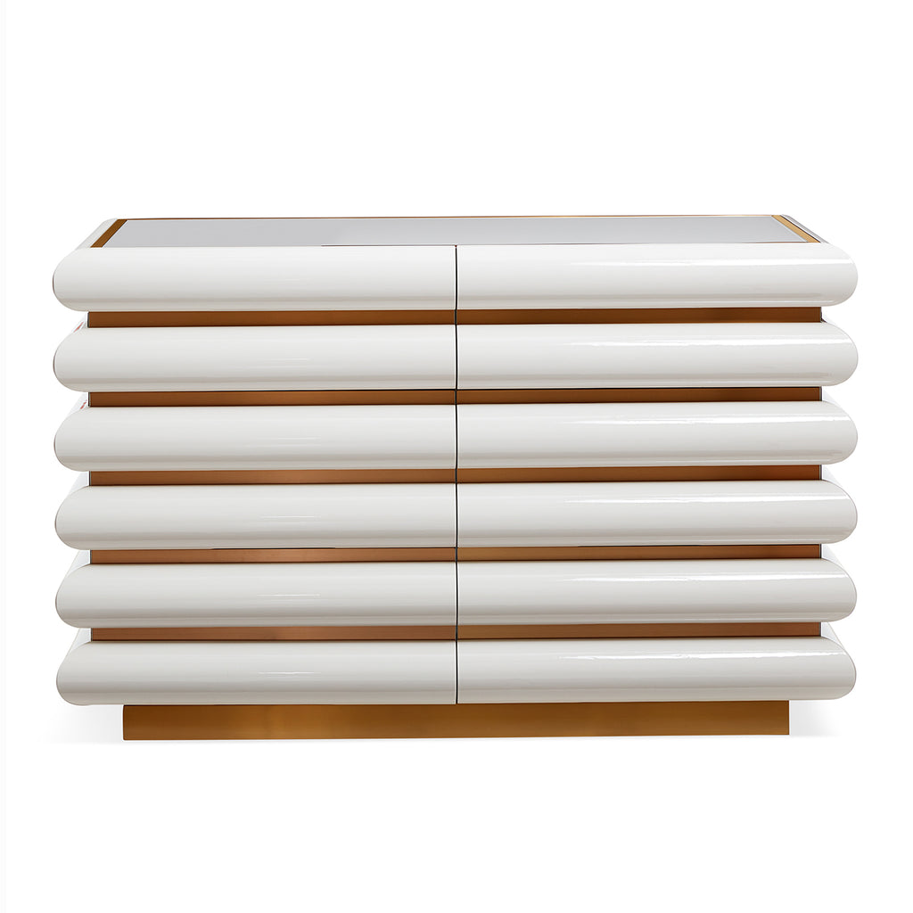 Floating on a recessed base, our Kiki dresser features a brushed brass cabinet faced with puffy capsules in glossy deep teal or ivory lacquer. Topped with ivory back painted glass and fitted with six velvet-lined interior drawers for stashing your stuff. Fabulously futuristic in a grand foyer and just as glamorous in modern boudoir.