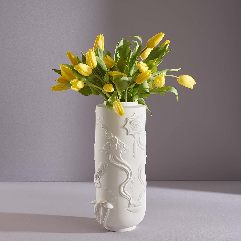 Introducing an ultra-surreal addition to our iconic Muse pottery collection—the Dreamscape Vase, an oversized vessel wrapped in trippy designs pulled from some of our favorite collections. Each thoughtfully hand-carved detail is cast in the highest quality matte porcelain and applied to an oversized vessel to create a room-making moment. The perfect piece to plunk on a pedestal, or let it anchor an attention-getting console ‘scape.