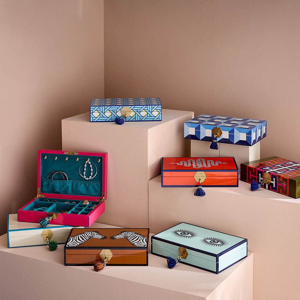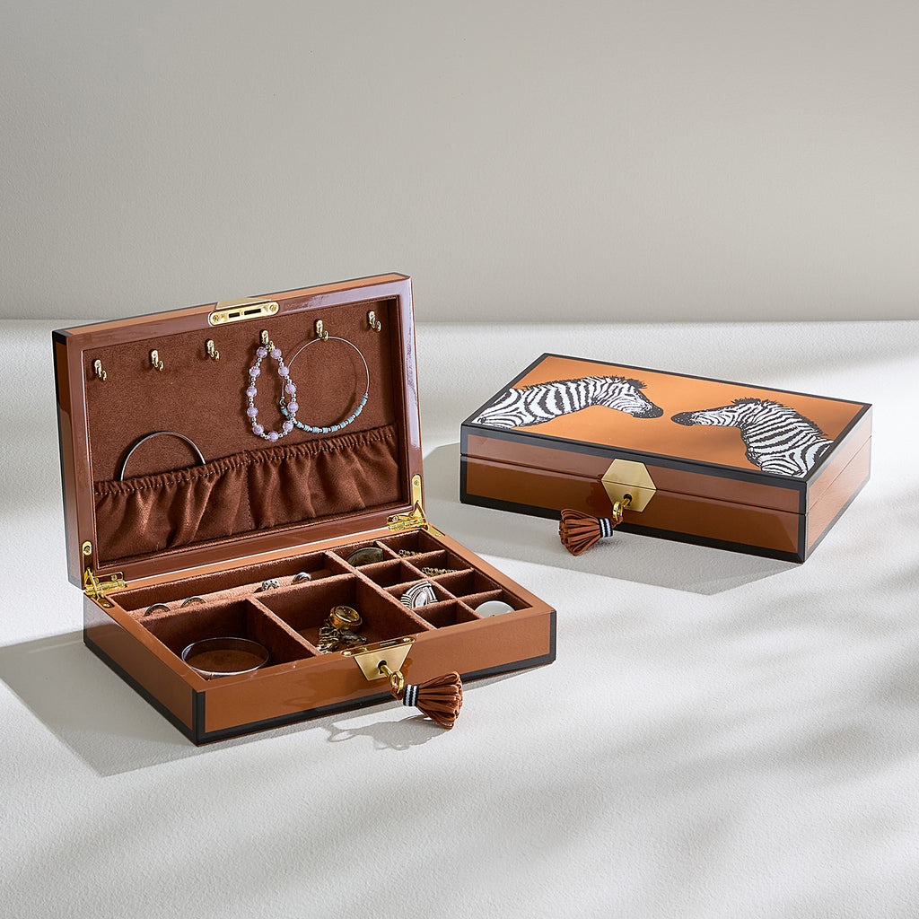 Give your gems, jewels and baubles a polished place to rest with our hand-finished, high-gloss lacquer Zebra jewelry box. Featuring a pair of divinely striped equines on a toasty cognac background and a luxe camel velvet-lined interior. A little WASPy chic, a lot of savage style. Its front key-closure is marked with our signature hexagonal brass-plated keyplate.
