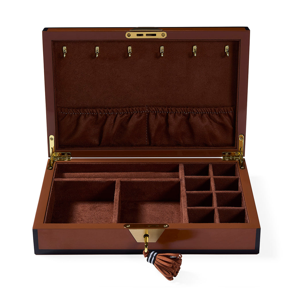 • Multi-color lacquer box fixed with our signature hexagonal brass key plate, Brown velvet-lined interior