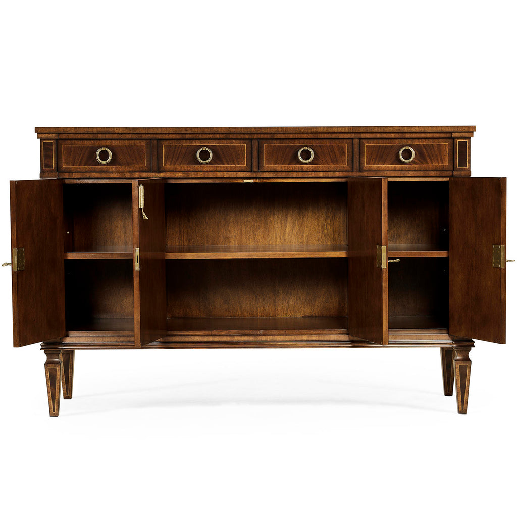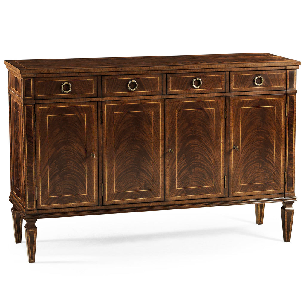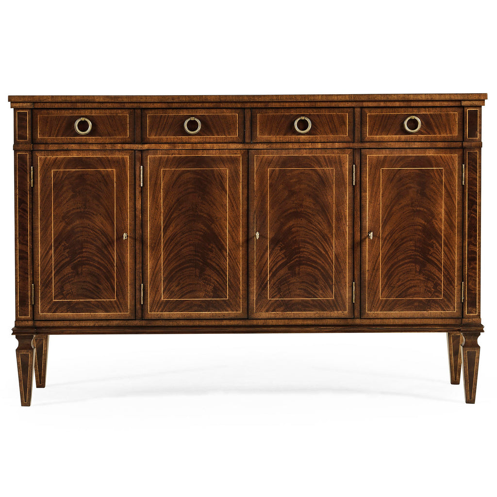 Substantial Regency style flat fronted rectangular sideboard with four doors, flame mahogany veneers, and four drawers to the upper register. Contrasting stringing throughout and raised on square cross-section feet.