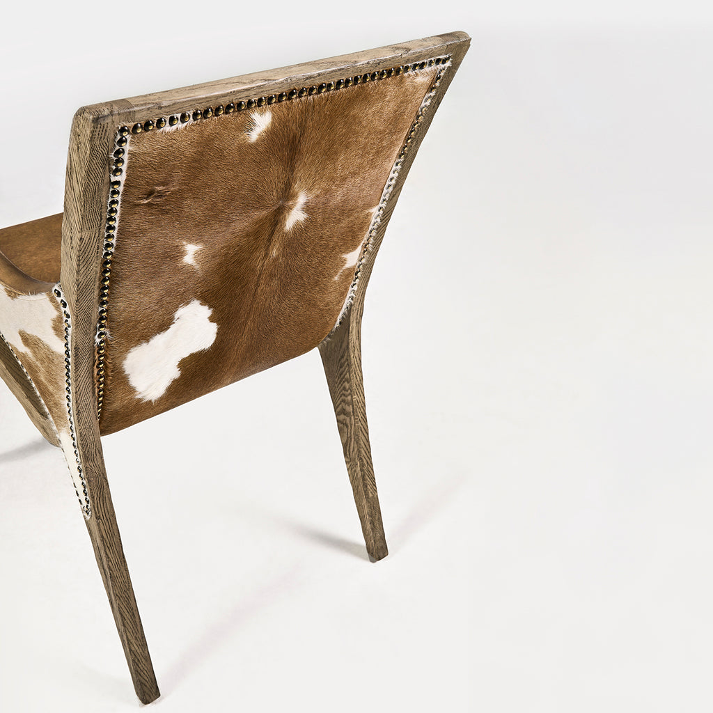 The Echo Canyon Arm Chair is a stunning blend of rustic charm and refined style. Upholstered in luxurious hand-stained leather, this chair is enhanced by distinctive cowhide side arm and nail head accents, adding a unique, natural touch that sets it apart. The faded oak frame brings warmth and character, offering a sturdy and elegant foundation. CRAFTED FROM NATURAL HIDES, EACH PIECE FEATURES UNIQUE VARIATIONS IN PATTERN AND COLOR, ENSURING NO TWO ARE EXACTLY ALIKE. A ONE-OF-A-KIND STATEMENT OF AUTHENTICITY AND STYLE.