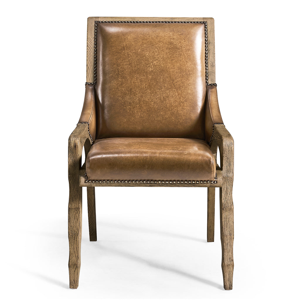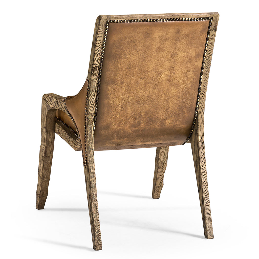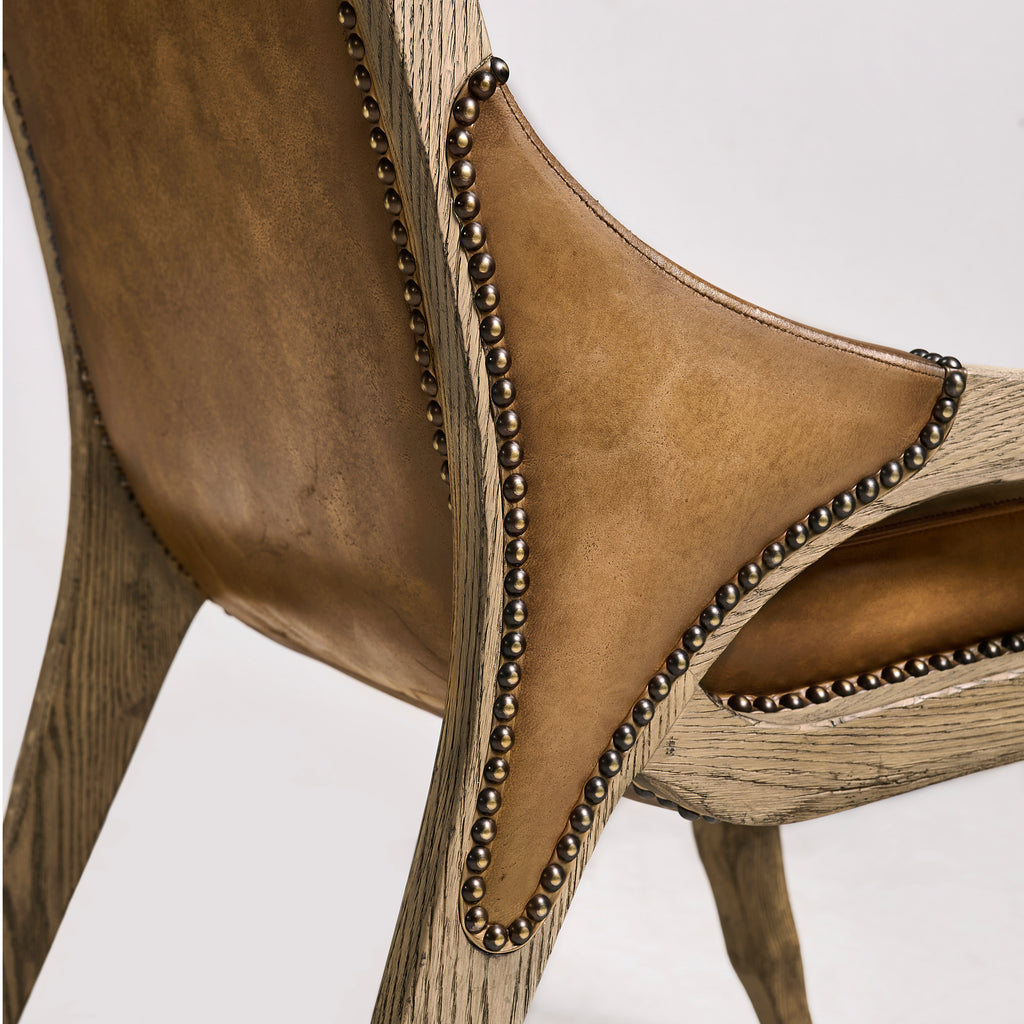 The Echo Canyon Side Chair is a stunning blend of rustic charm and refined style. Upholstered in luxurious hand-stained leather, this chair is enhanced by distinctive low side arm and nail head accents. The faded oak frame brings warmth and character, offering a sturdy and elegant foundation. CRAFTED FROM NATURAL HIDES, EACH PIECE FEATURES UNIQUE VARIATIONS IN PATTERN AND COLOR, ENSURING NO TWO ARE EXACTLY ALIKE. A ONE-OF-A-KIND STATEMENT OF AUTHENTICITY AND STYLE.