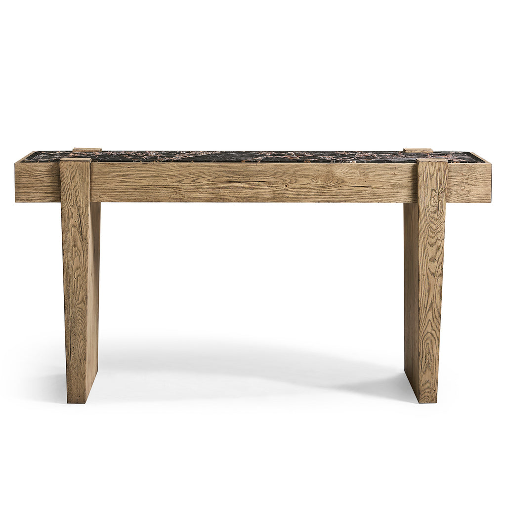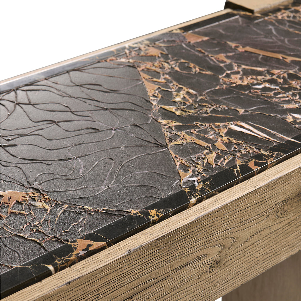 The Echo Canyon Console Table features a beautifully crafted pedestal base in a faded oak frame, which adds warmth and texture to the home. Its standout feature is a marble top made with a unique in-house technique, offering a dimensional stone surface that enhances the table's refined, natural aesthetic.