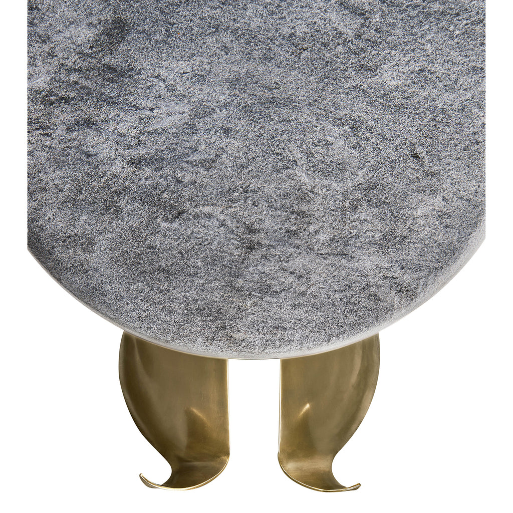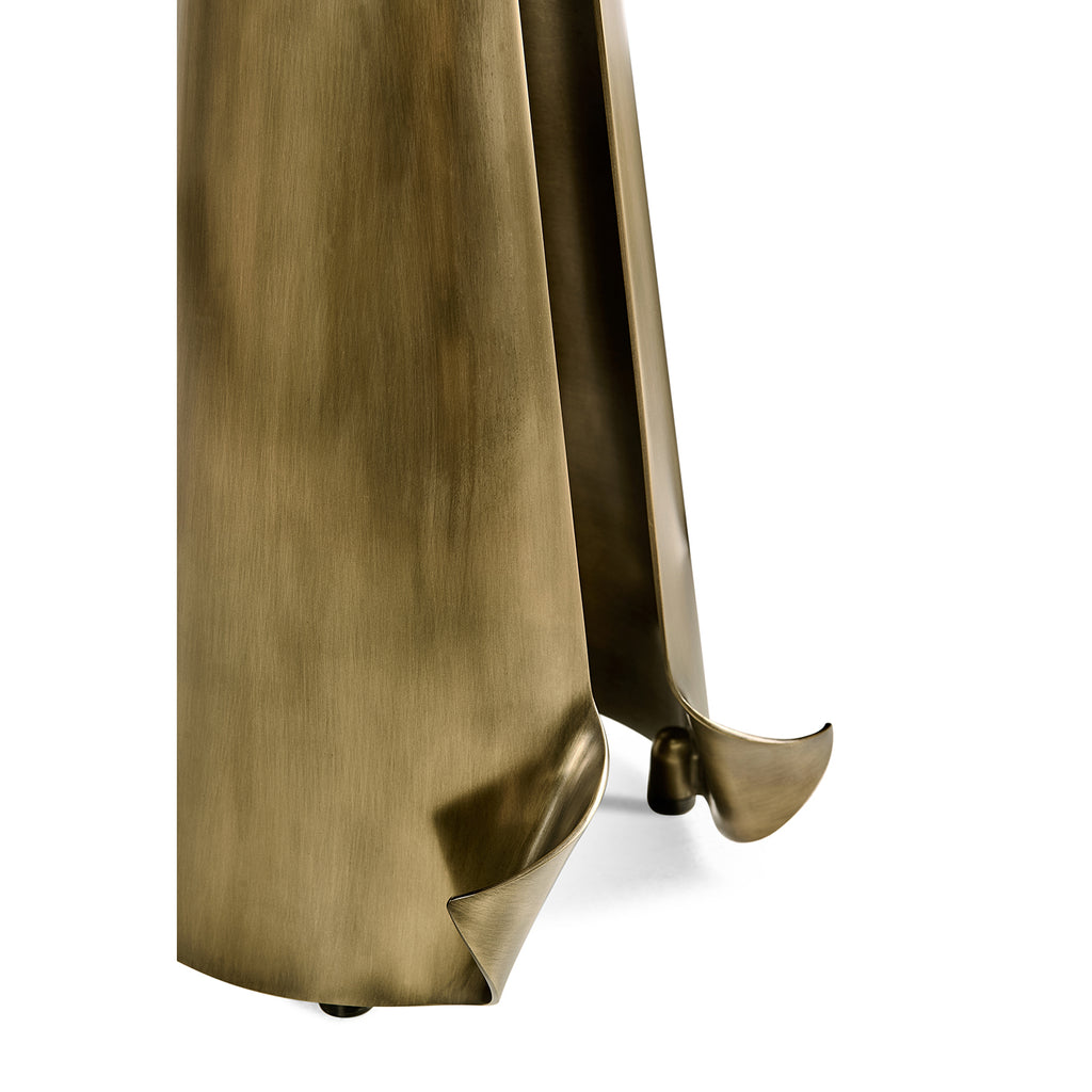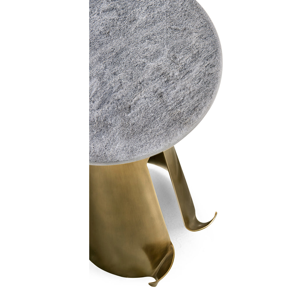 The Hammersmith Drink Table features a bold, sculptural base crafted from bent brass sheet oozing sophistication and artistry. The rich, dark grey stone top offers a striking contrast to the warm metallic tones, creating an eye-catching piece that serves as both functional and decorative.