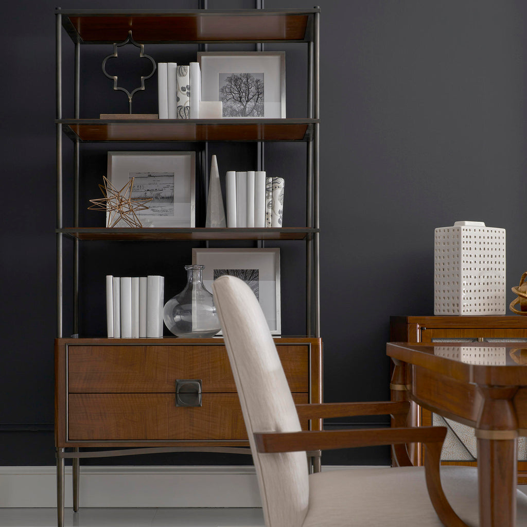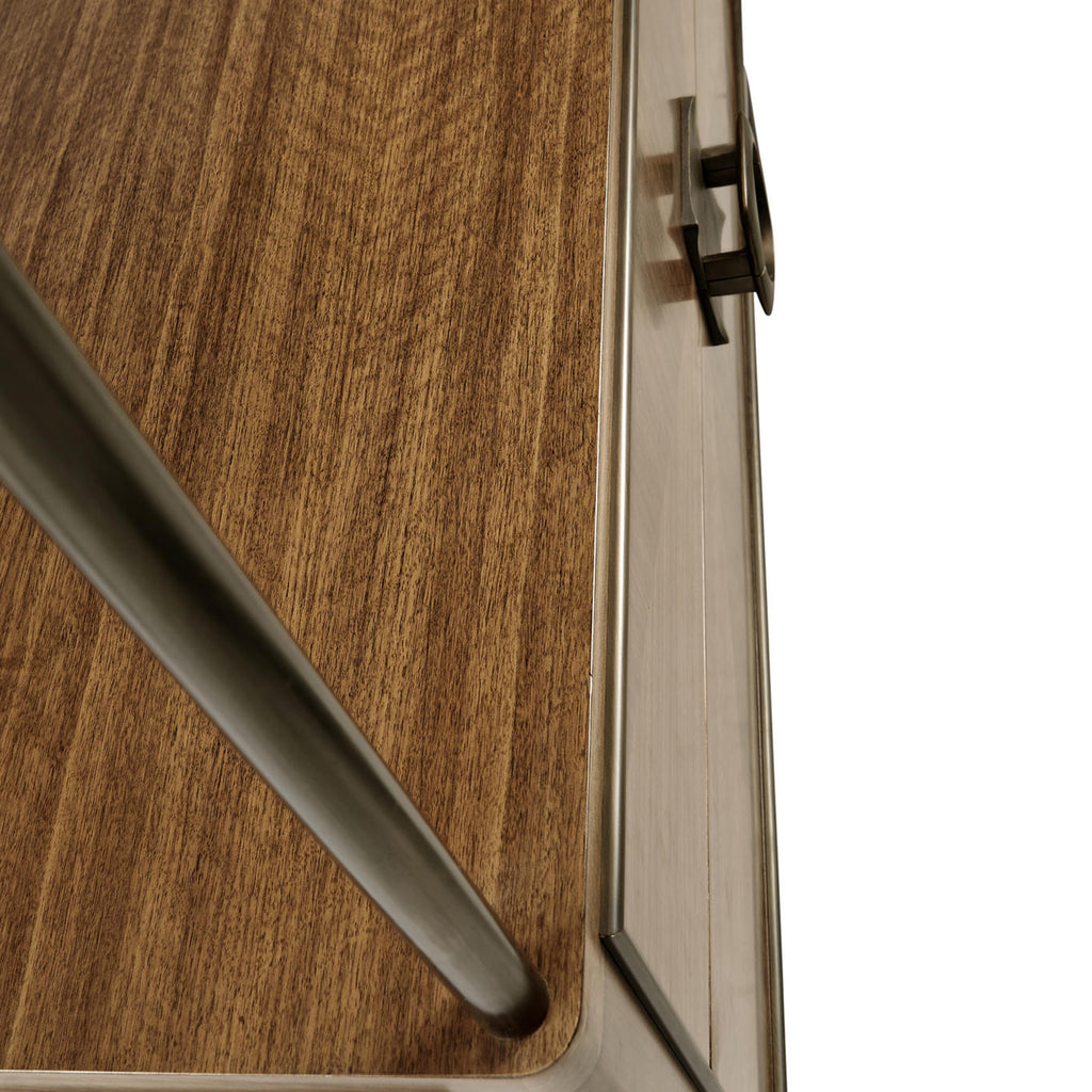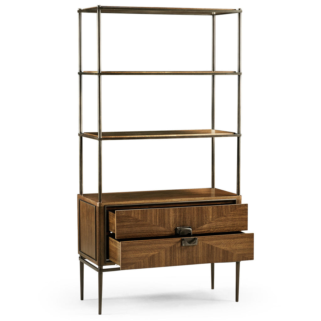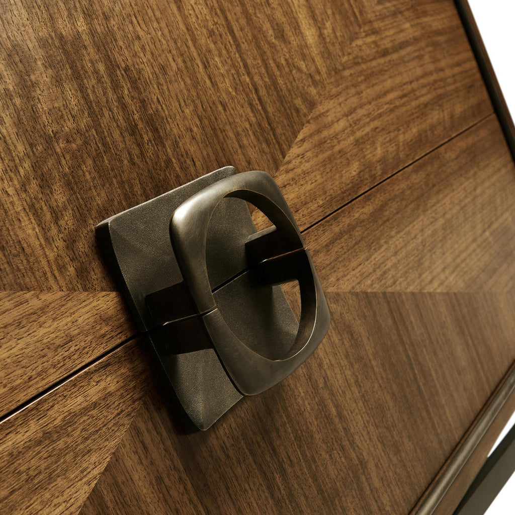 This cabinet is constructed of American walnut with a transparent, lacquer finish. Door features quartered wlanut veneer in a box pattern. The brass hardware is cast in the Jonathan Charles foundry, acid dipped and hand rubbed to achieve a deep, natural patina.