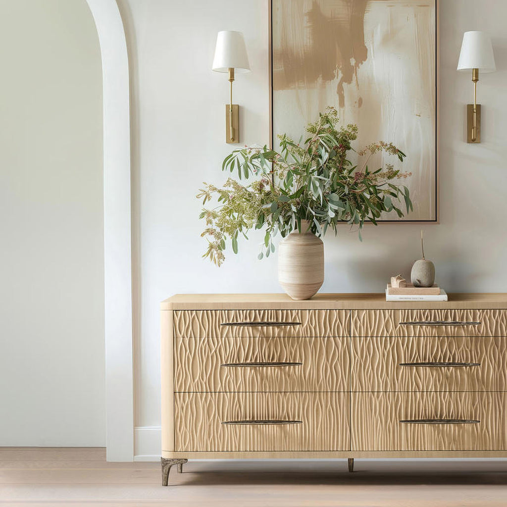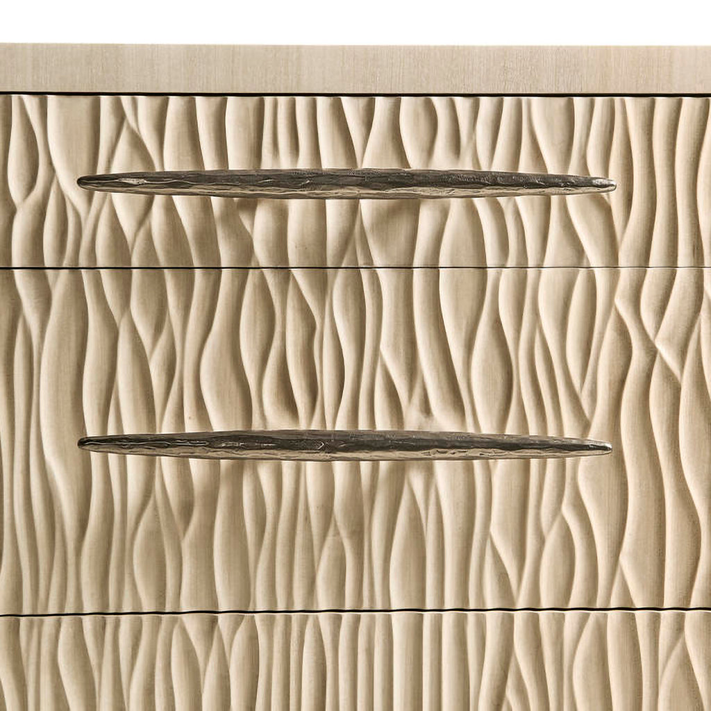 Impressive and spacious, the Undercurrent dresser offers both functionality and polish. Both the legs and hardware are made from stainless steel patterned from hand-carved wax moldings at our in-house Foundry. The six drawer fronts are all dyed Koto veneer with a carving effect mimicking sand patterns created by water currents. Used as a stand alone piece or paired with its matching bed and nightstand, this dresser will stun.