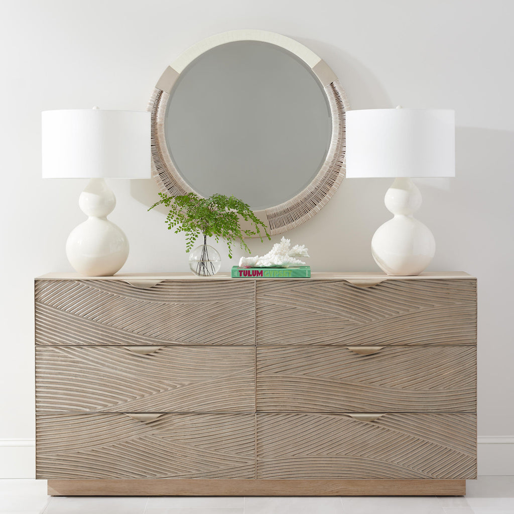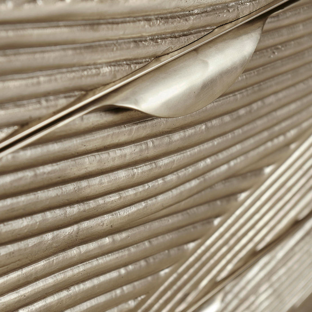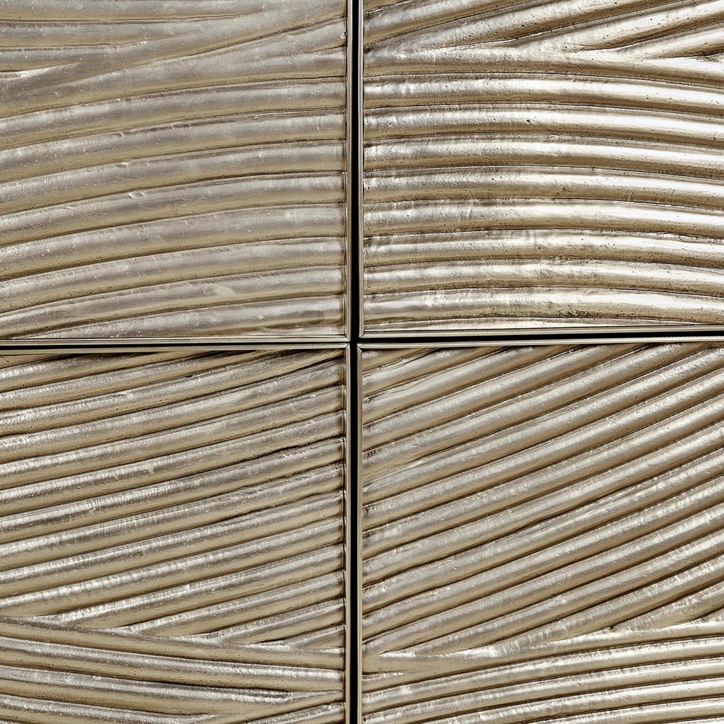 The Jonathan Charles Water Capillary Cast Metal Texture Double Dresser from Jonathan Charles’ Water portfolio features sculptural metal drawer fronts with a hand carved wave motif in Satin White Brass that shimmers against a Bleached Oak case. Understated functional elements such as masterfully shaped Stainless Steel pulls custom cast in Jonathan Charles’ foundry and a recessed hardwood pedestal blend seamlessly into Capillary’s alluring forms.