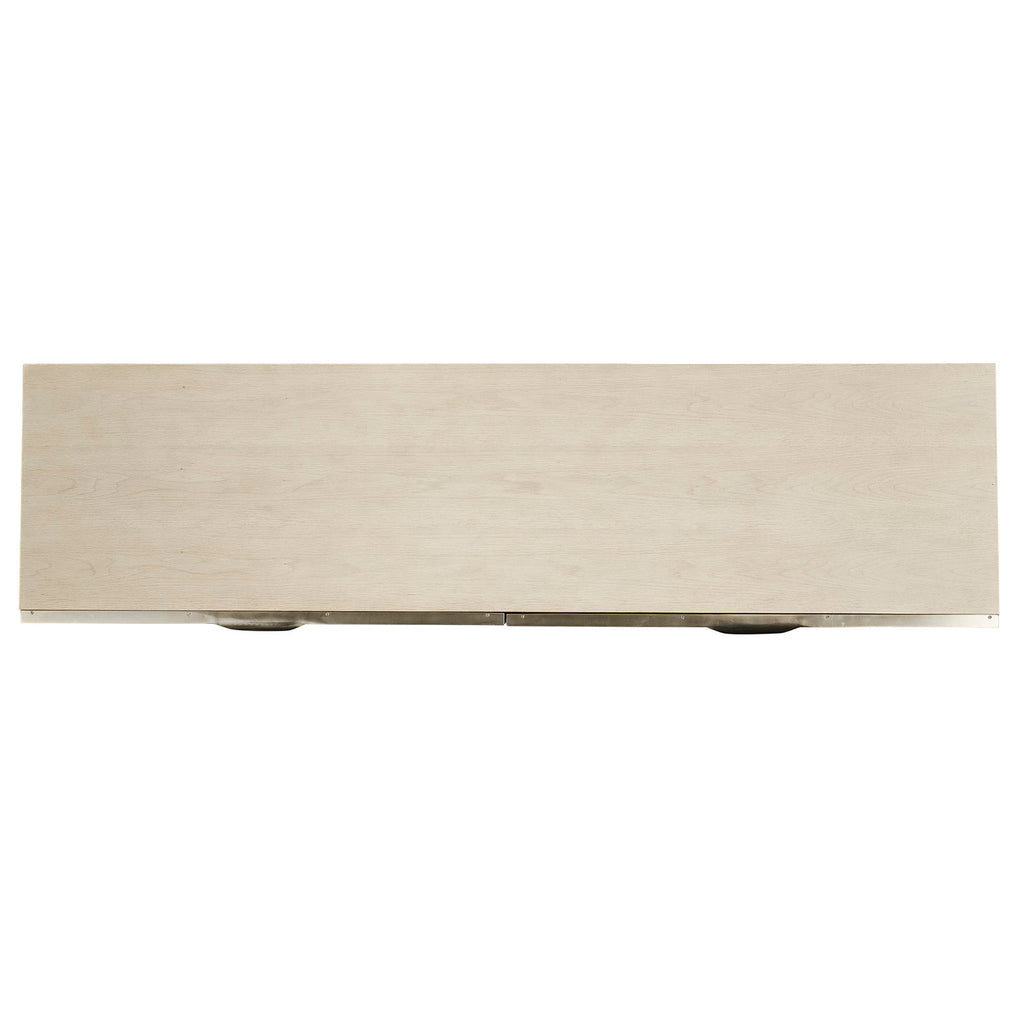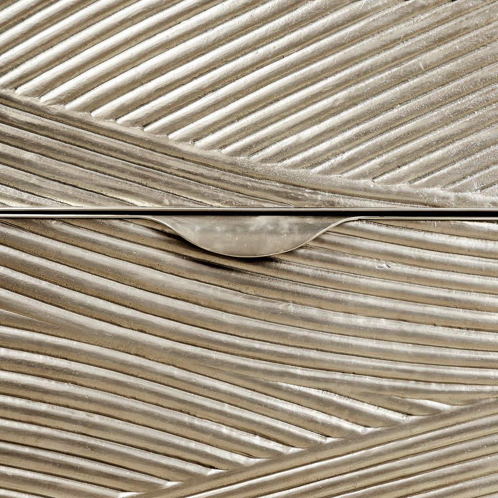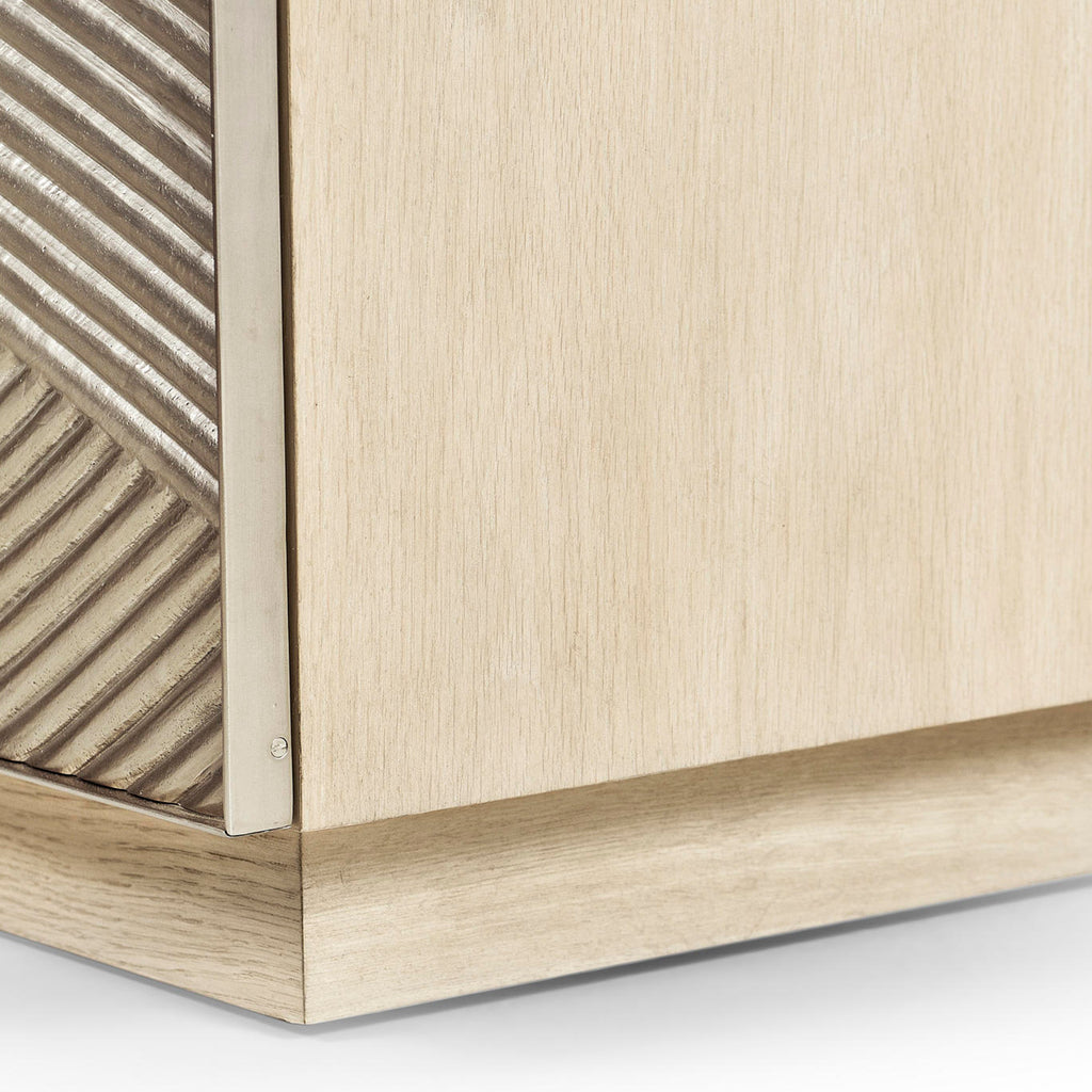 The Jonathan Charles Water Capillary Cast Metal Texture Double Dresser from Jonathan Charles’ Water portfolio features sculptural metal drawer fronts with a hand carved wave motif in Satin White Brass that shimmers against a Bleached Oak case. Understated functional elements such as masterfully shaped Stainless Steel pulls custom cast in Jonathan Charles’ foundry and a recessed hardwood pedestal blend seamlessly into Capillary’s alluring forms.