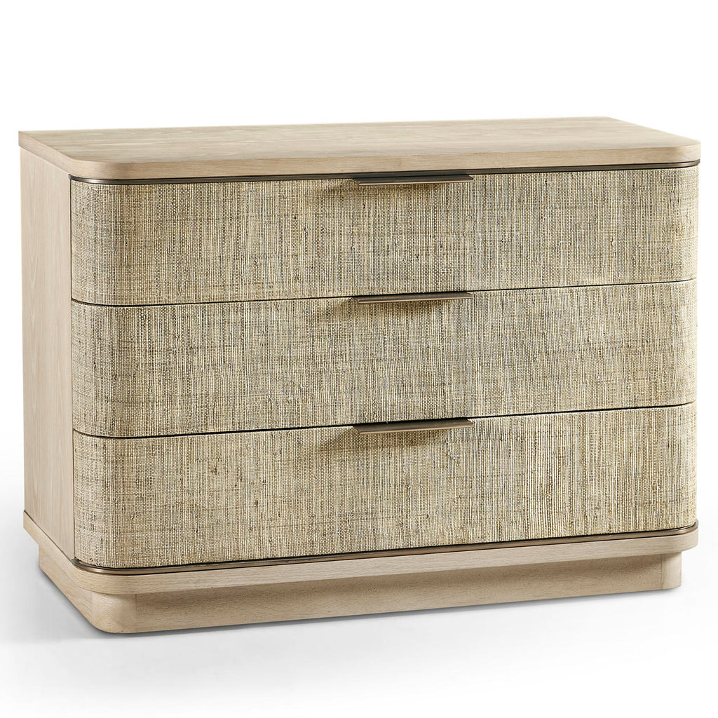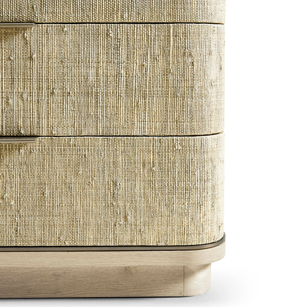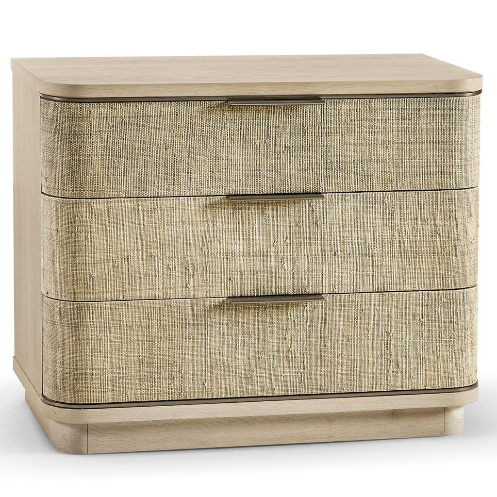Born from passion with incredibly crafted aesthetic details, the Jonathan Charles Seiche Woven Wave Night Chest’s captivating lines and sublime curves promise a new level of interior expression. Grasscloth wrapped around three Bleached Oak drawers with custom cast hardware in an eclectic mix of materials that captures a dazzling sense of organic movement and form.