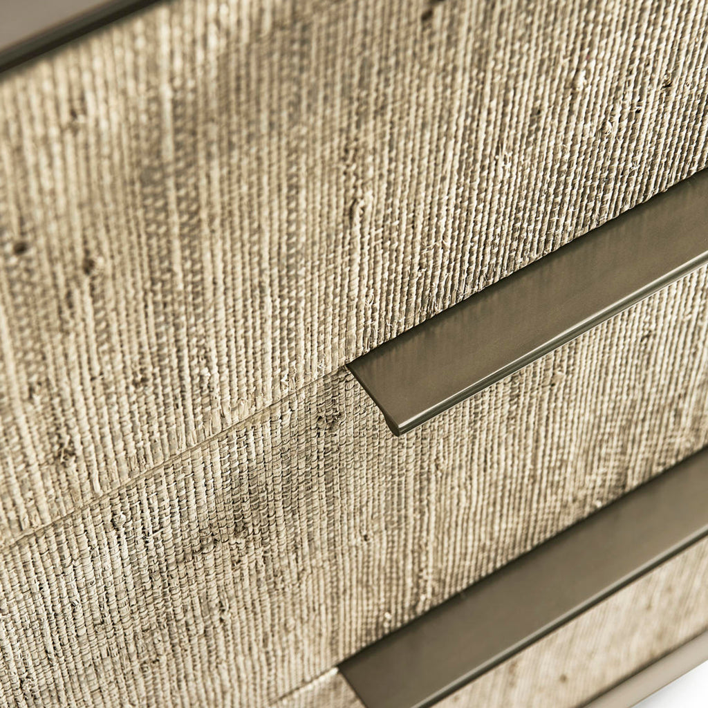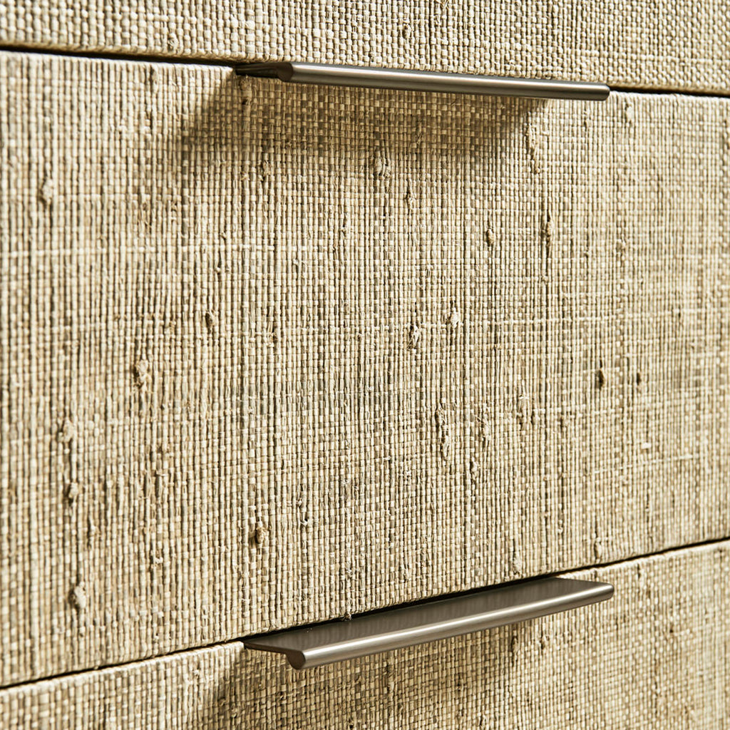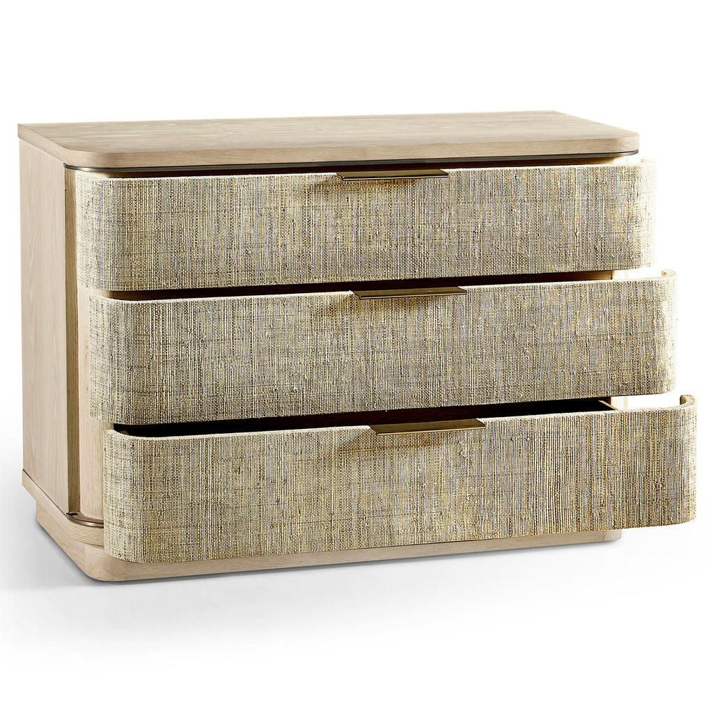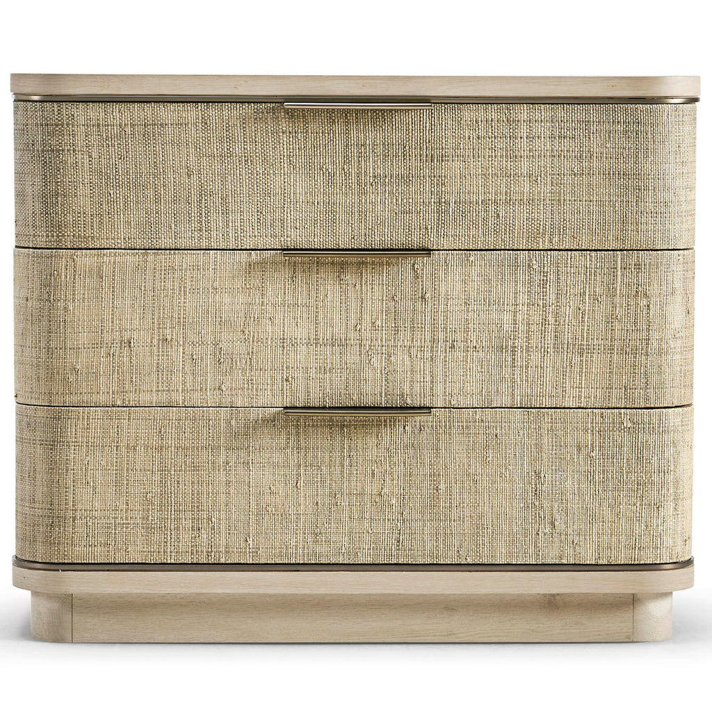 Born from passion with incredibly crafted aesthetic details, the Jonathan Charles Seiche Woven Wave Night Chest’s captivating lines and sublime curves promise a new level of interior expression. Grasscloth wrapped around three Bleached Oak drawers with custom cast hardware in an eclectic mix of materials that captures a dazzling sense of organic movement and form.