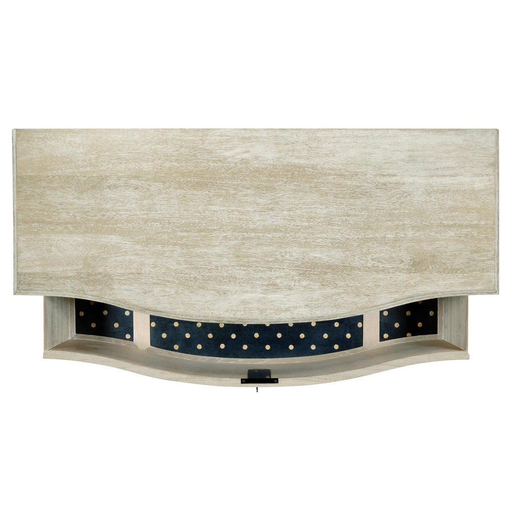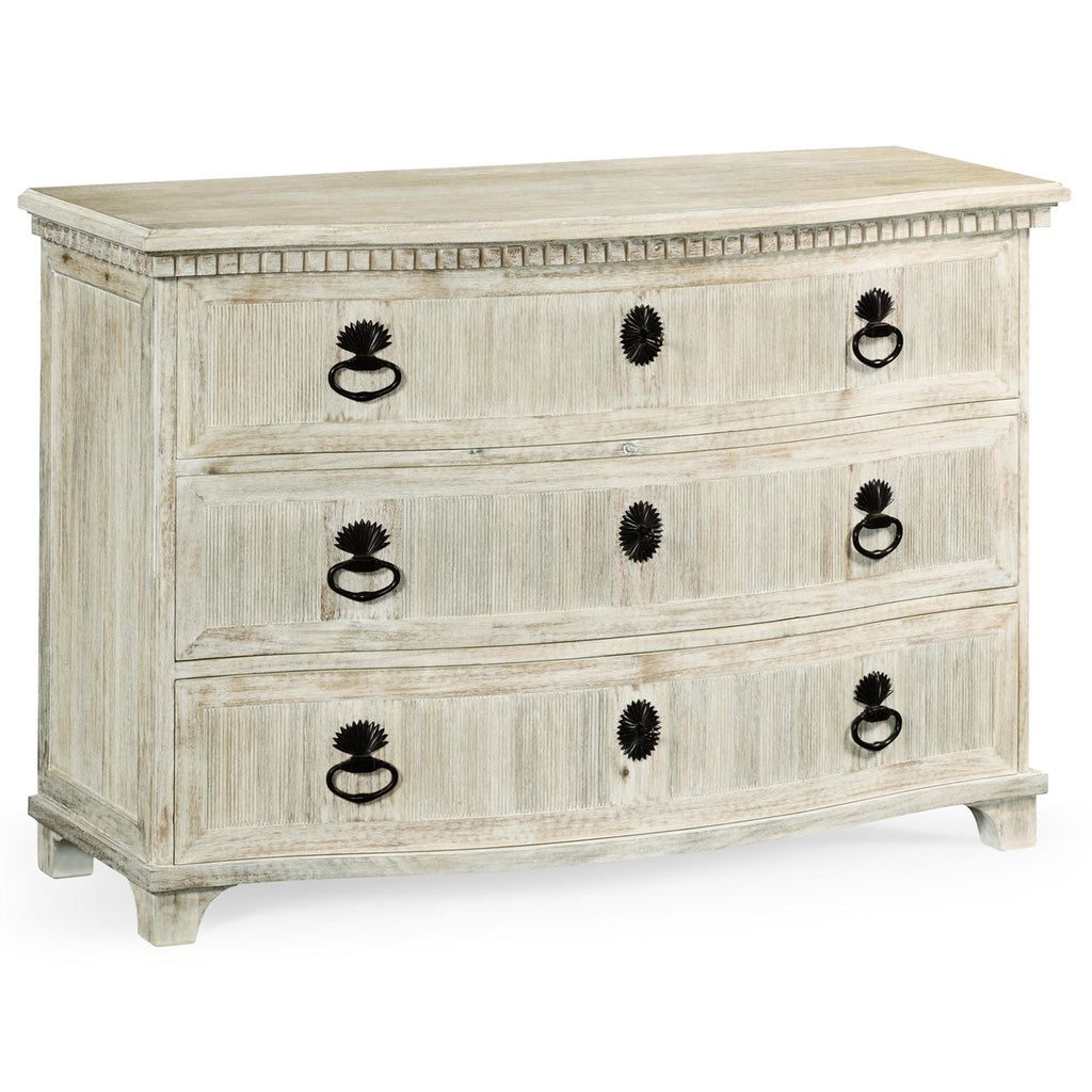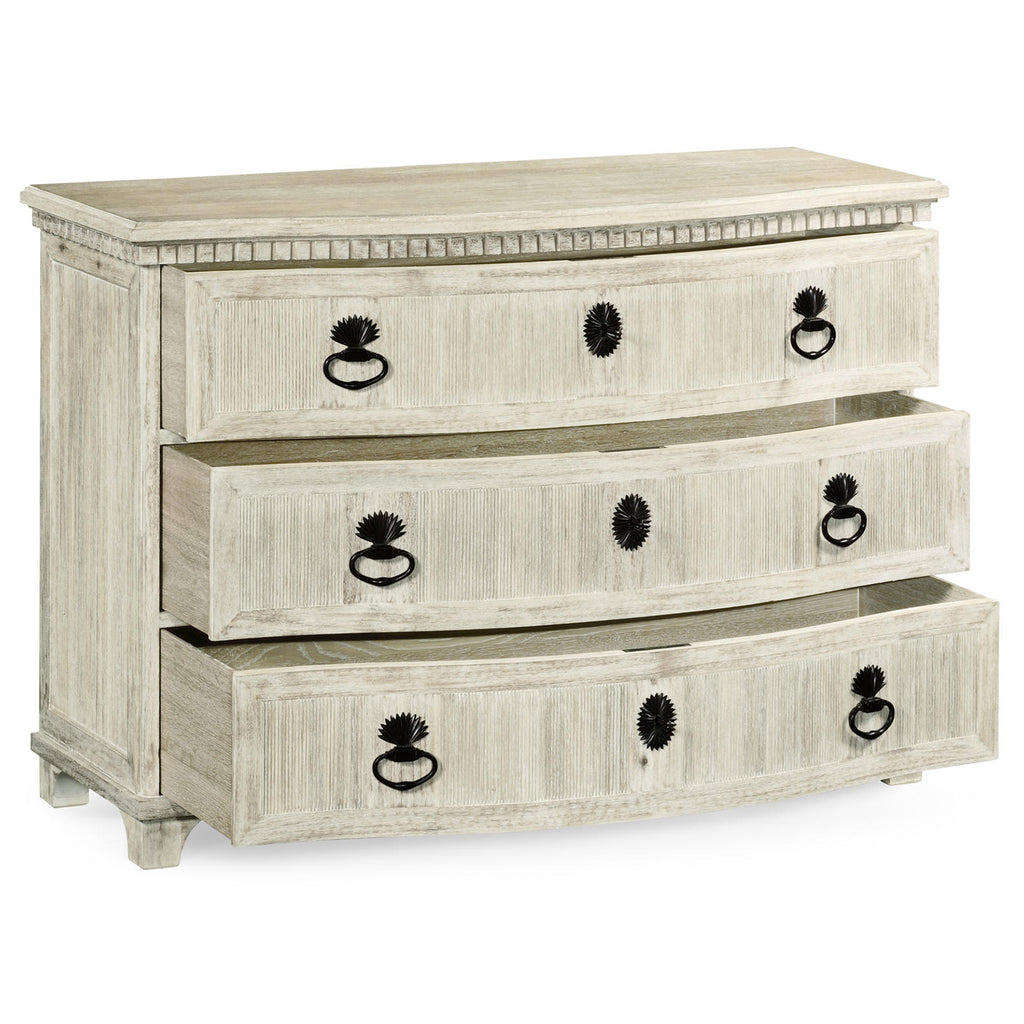 The Jonathan Charles William Yeoward Bickerton 3 Drawer Dresser with its extraordinary and much admired bronze hardware was inspired by an English 18th century chest in the painted Swedish genre. This bow-fronted piece with its polka dot drawer lining is a classic in its own time. Use it in an entry or a bedroom or even as a pair, each side of a chimney piece in a drawing.