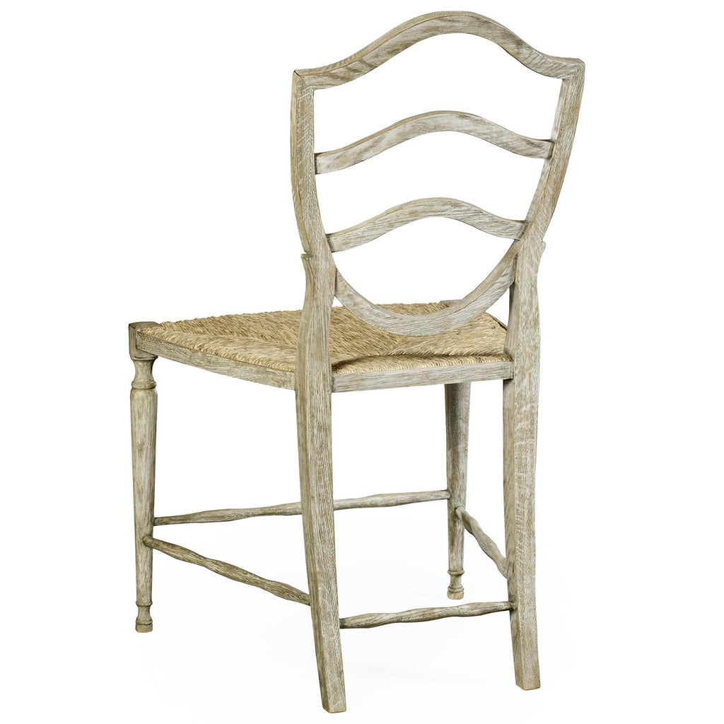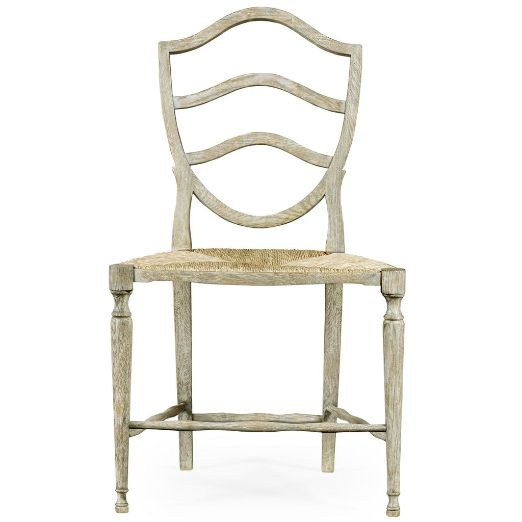 This Jonathan Charles William Yeoward Bodiam side chair is constructed of grayed oak and taken from an early C19th painted piece at home. This chair has been given a modern finish with fine hand rushing and plenty of care makes it charming. The Bodiam is also strong and durable, and can be used in kitchens and dining rooms.