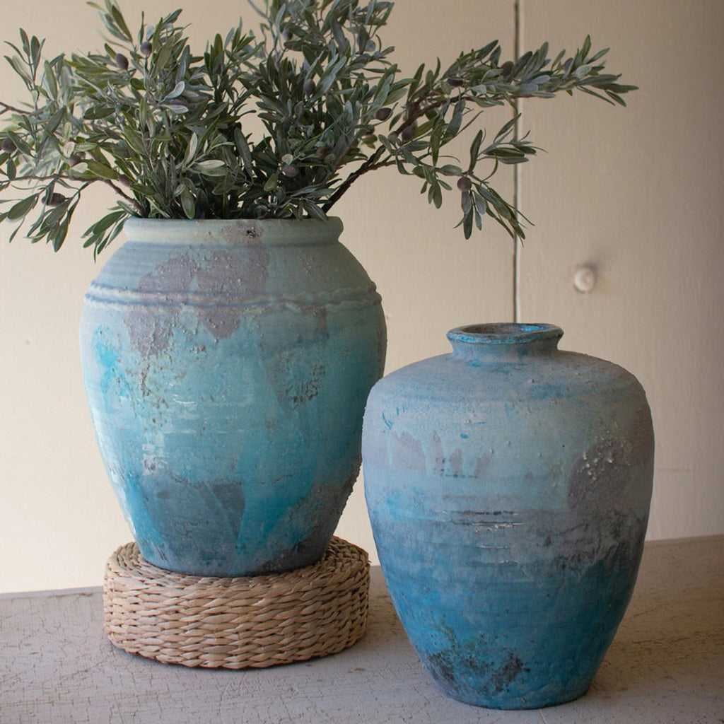 This large antique blue ceramic urn with wavy detail is perfect for a potted plant or tree. Elevate it from the floor with a riser or use it in your entryway.