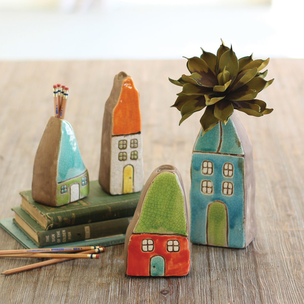 These bright and fun unique house vases are sure to warm up any space with an eclectic sense of charm. The set of four includes one of each house, each with its own unique design and crackled ceramic finish. Pop a fresh flower in and give as a gift!