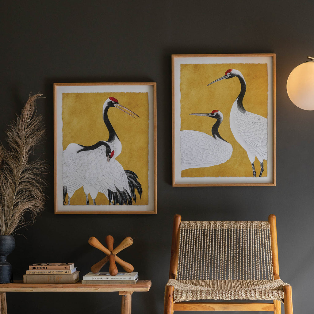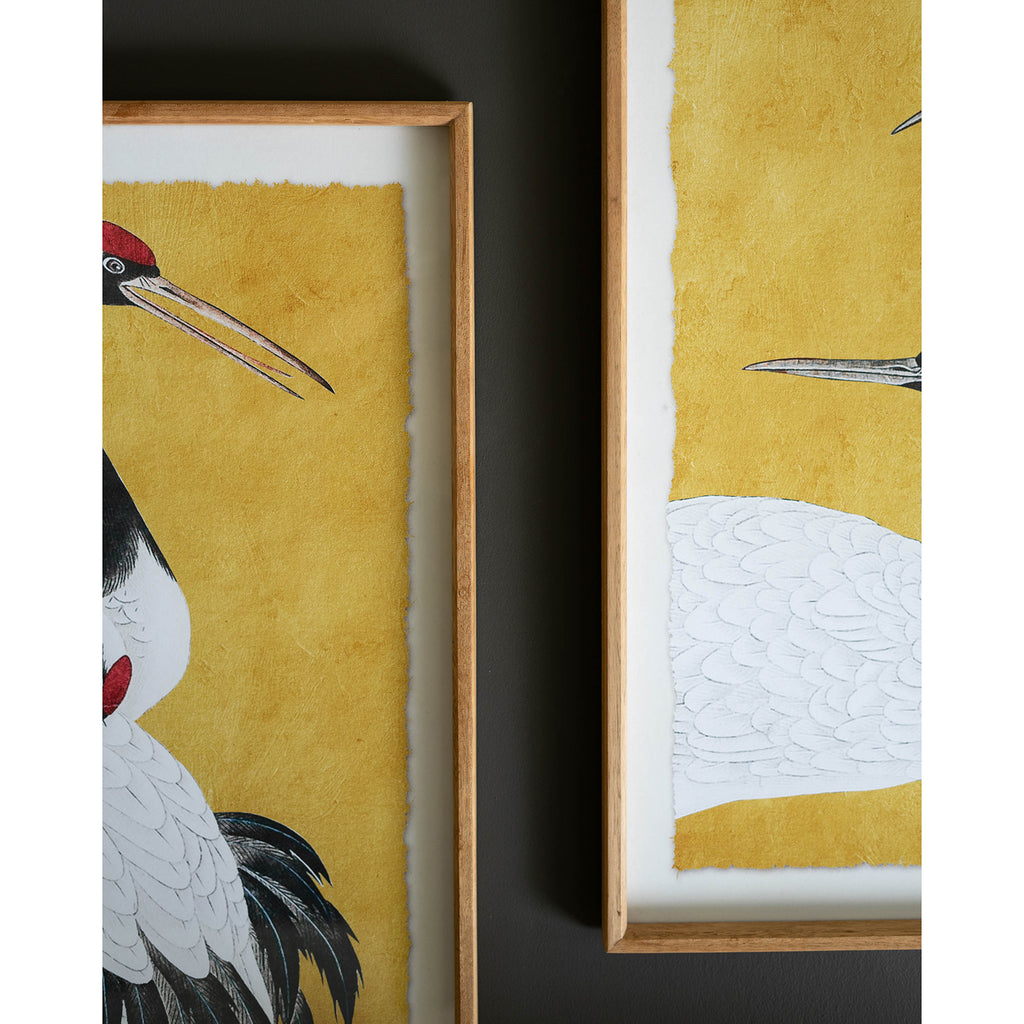 Majestic black and white birds rest against a golden background. These simple framed prints look good in a neutral space or as a colorful addition to dark or muted walls.