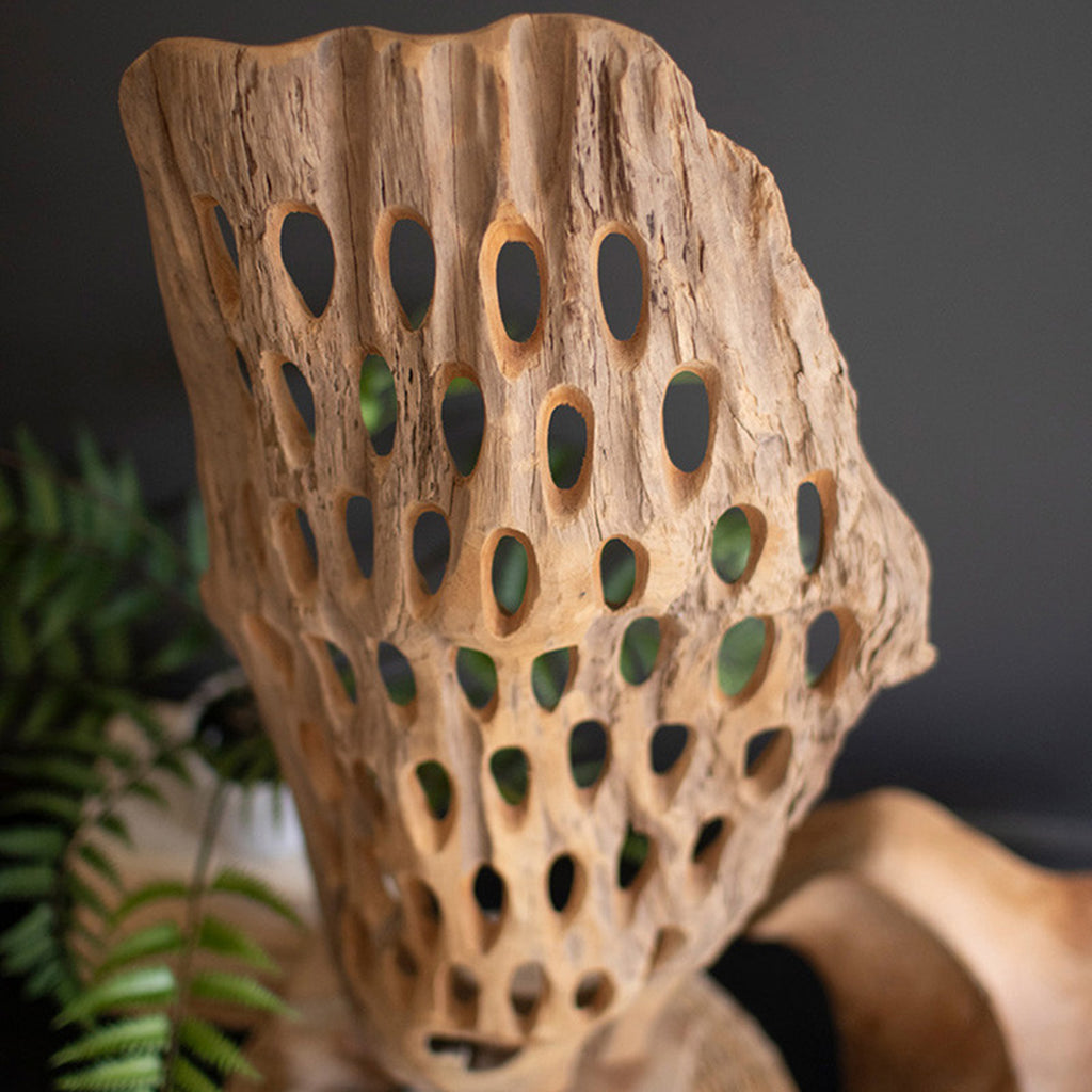 This perforated teak wood sculpture on a base keeps the air moving. Use one in your ocean-side villa or guest bathroom. Get creative and hang your earrings or let the natural wood shine through.