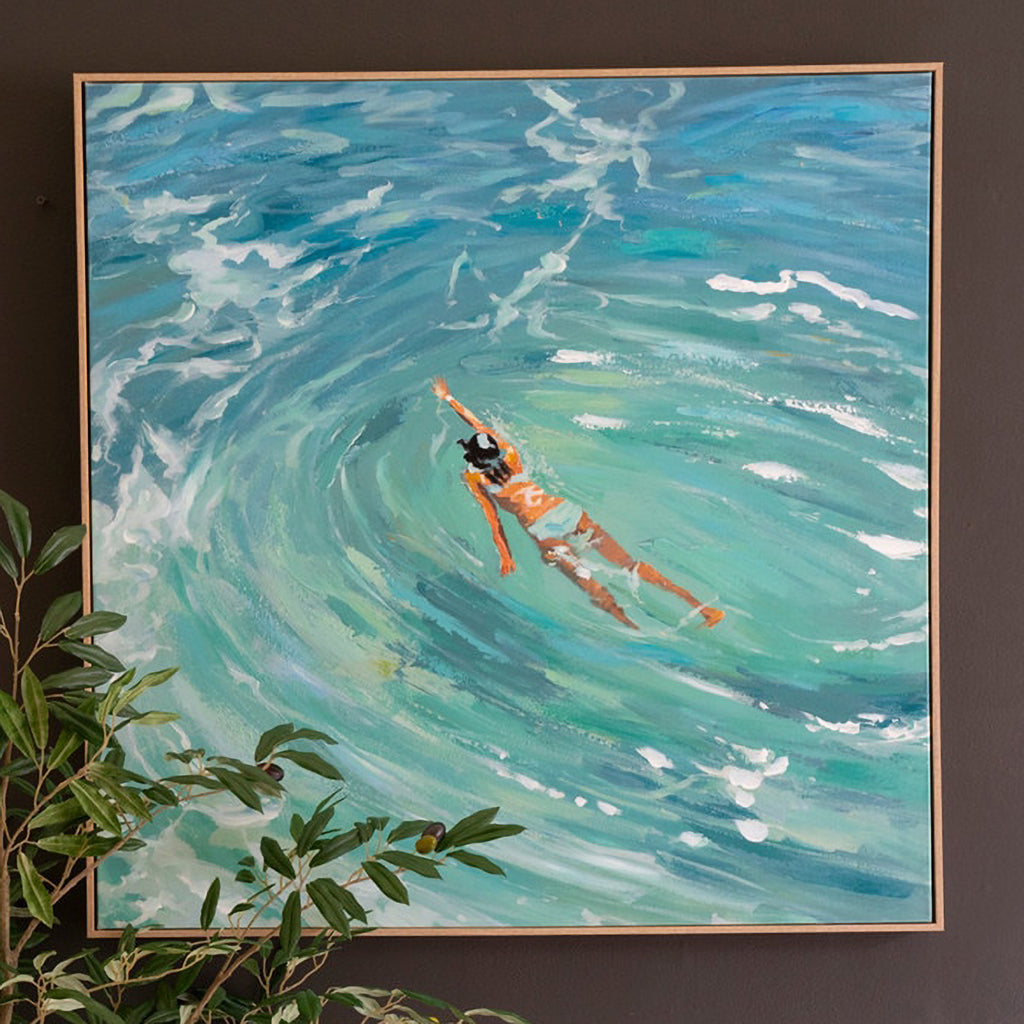 Wave goodbye to boring decor. Beautiful blues highlight a single swimmer braving the tide. This framed acrylic painting can serve at the beach or as a reminder never to give up.