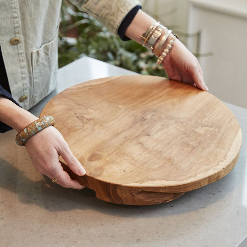 Serve treats or a charcuterie spread, display plants, or prep meals with the stunning, oversized teak wood Anza Cutting Board. Handmade & food-safe, this decorative piece features all-natural materials, which creates slight surface variation. Cut-outs on the underside allow for easy handling & transport from room to room.