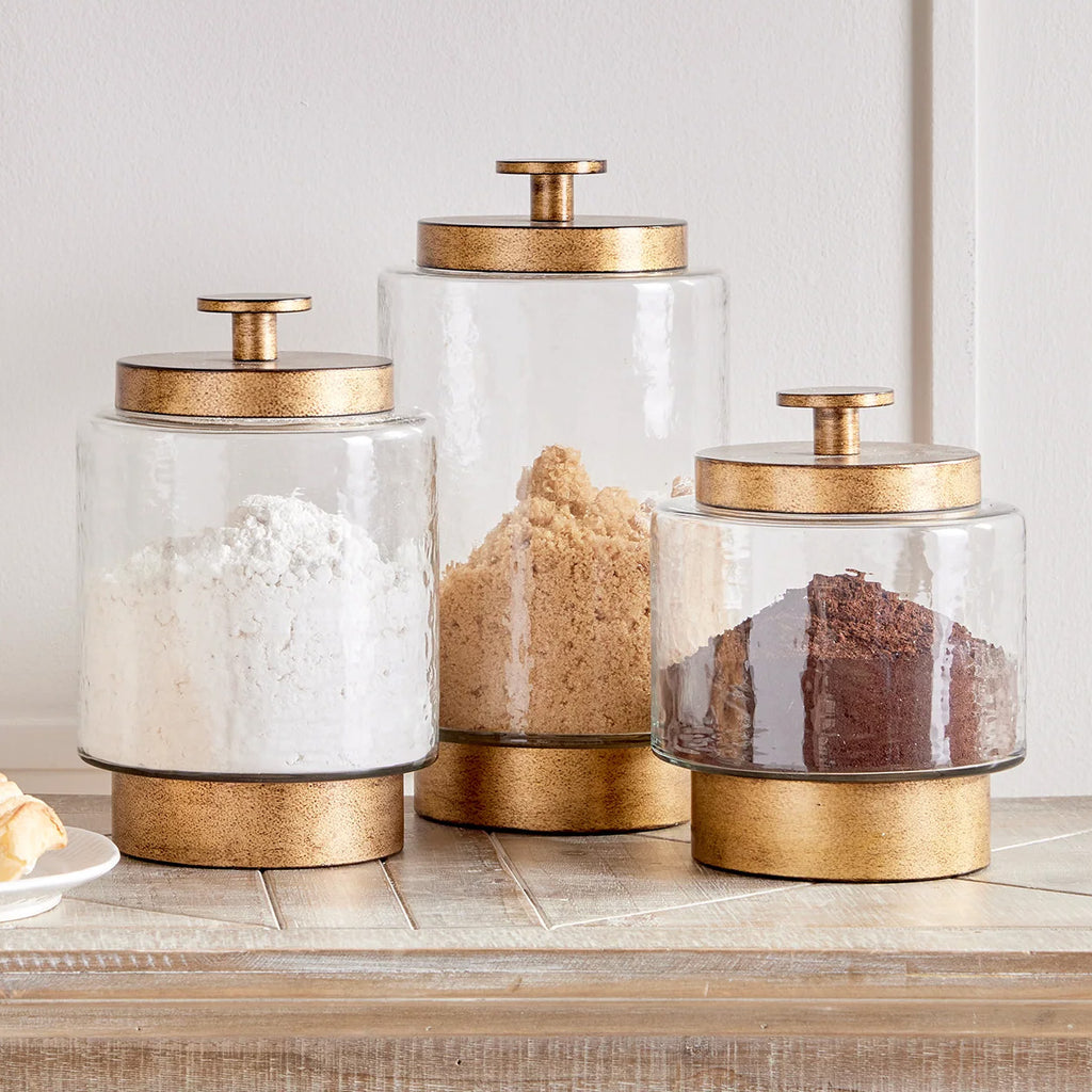 In a classic mix of seeded glass and metal, these canisters are a handsome set. Perfect for countertop storage, or beautiful accents all on their own.