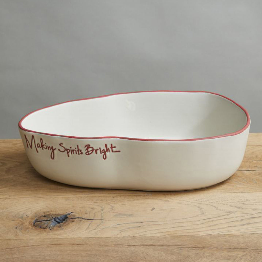Display the natural beauty of evergreens with this ceramic holiday serving dish. Featuring an organic shape & hand-painted details with etched greenery & lettering, this dish brings a handmade, understated elegance to the table.