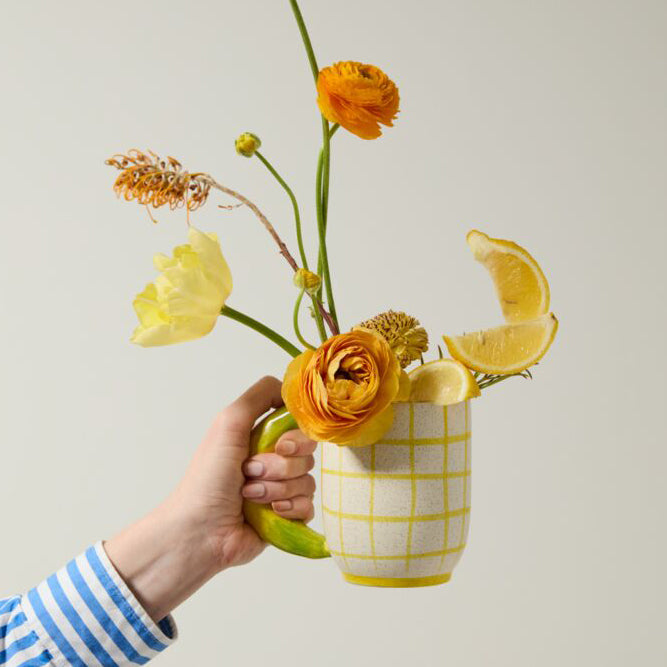 Fresh, fruity, & playful, the Fresh Fruit Mug is a delightful, colorful beverage vessel option for the kitchen. This food-safe mug & saucer combo is hand painted & features speckled smooth ceramic with a yellow grid pattern on top. The best part is the yellow banana handle! This quirky, trendy piece makes a great gift & can even be used for a small drop-in plant. Pair with our other fruit-forward tableware items for a coordinated, summery look.