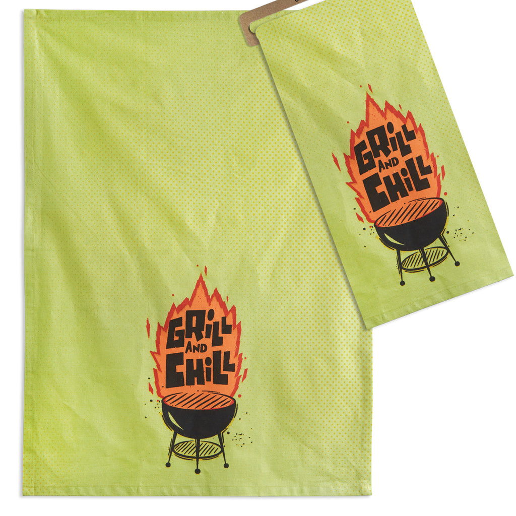 A relaxing weekend to grill and chill is what you need! Use this tea towel for all of your backyard grilling events. 100% cotton tea towel comes on a natural fiber hanger for easy display. Features a corner hanging tab. Machine wash cold. Tumble dry. Warm iron on reverse.