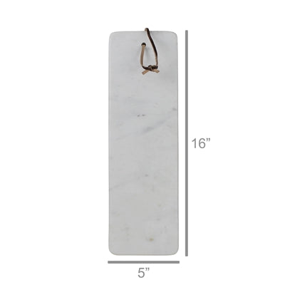 A subtly mottled white marble board is the perfect palate for a cheese service. 3in leather hanger. Hand wash is recommended.