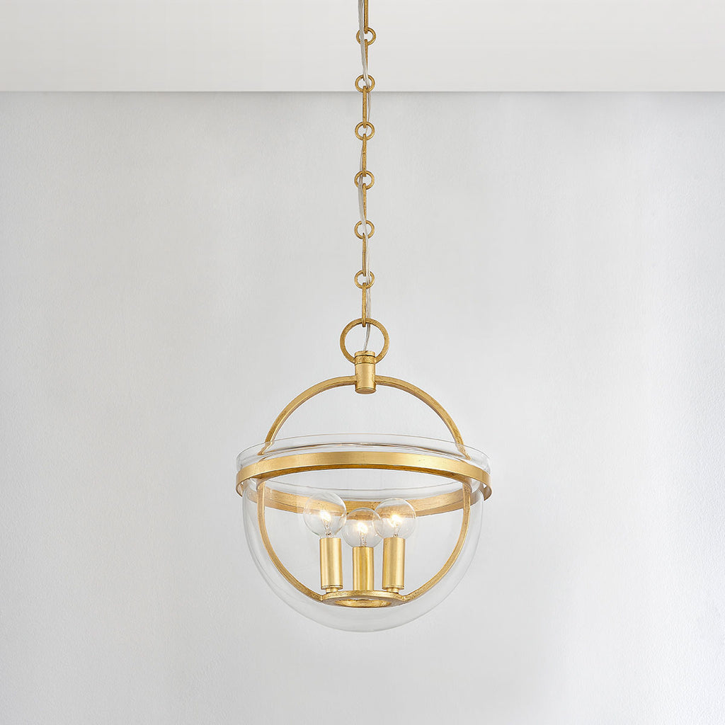 Renowned for built-to-last quality with a timeless feel, Hudson Valley offers a modern lighting collection with elegant touches, recalling vintage inspiration. The Hudson Valley Malloy lantern brings a chic, modern update to the traditional bell jar. An elongated semi-circular clear glass shade partially encloses an elliptical metal framework of Aged Iron or Vintage Gold Leaf. A matching metal band along the top of the glass holds the elements in place with screw details set on the interior band.
