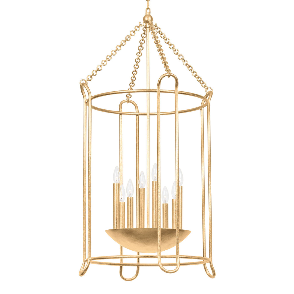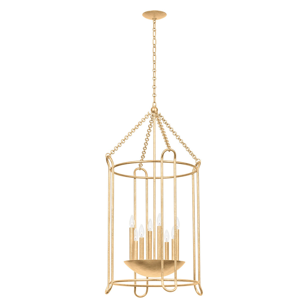 Casual, sophisticated, and little bit curious, express yourself with eclectic, artisan-made lighting by Troy. Streamlined, oval-shaped arms and a jewelry-inspired interlocking chain form the Troy Lassen's airy, sophisticated cage silhouette. Four, six or eight candlesticks rest elegantly in a unique bowl-shaped holder at the center, providing uplight from within. Choose from three sizes in a Black Iron or Vintage Gold Leaf finish.