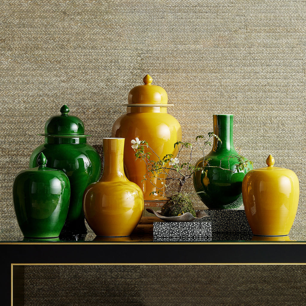 The Imperial Ginger Jar is a decorative jar that has its roots far in the past. The Imperial label is apropos for the porcelain jar because this piece is made of clay sourced from the area surrounding the kilns that produced objects for the Imperial estate during the heyday of the dynasties. The formulas to achieve the particular on this jar’s surface is a secret one guarded by ceramicist families devoted to the single color. The glossy, rich green was originally produced exclusively for those in high society and the bright yellow was originally produced to represent the Emperor in the Forbidden City.