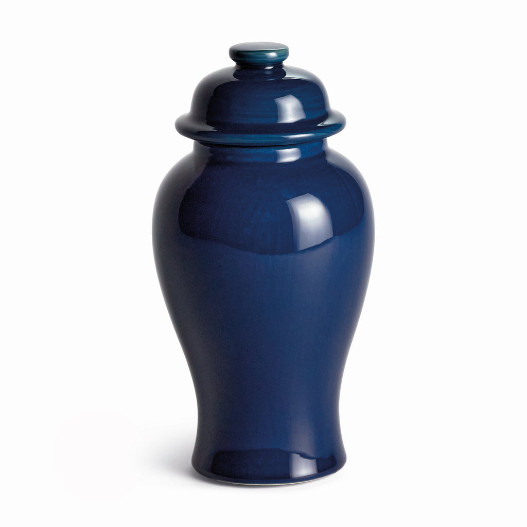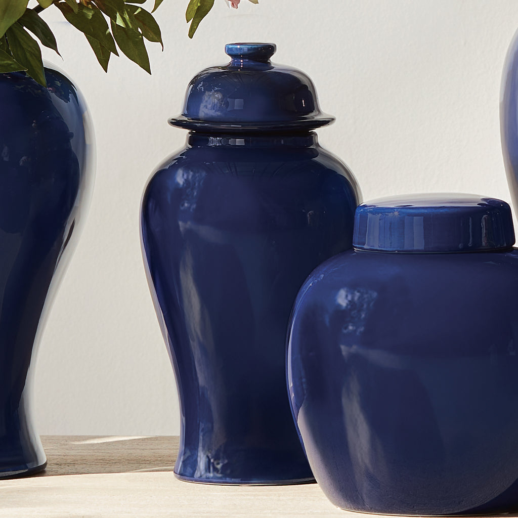 With a deep navy high gloss glaze, this lidded ginger jar is steeped in tradition. A perfect complement to the blue and white trend, and a solid choice to mix in among your patterned pieces in a bookshelf or on a credenza for a dynamic look.