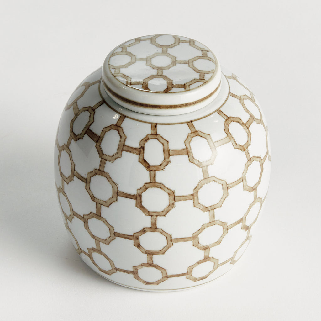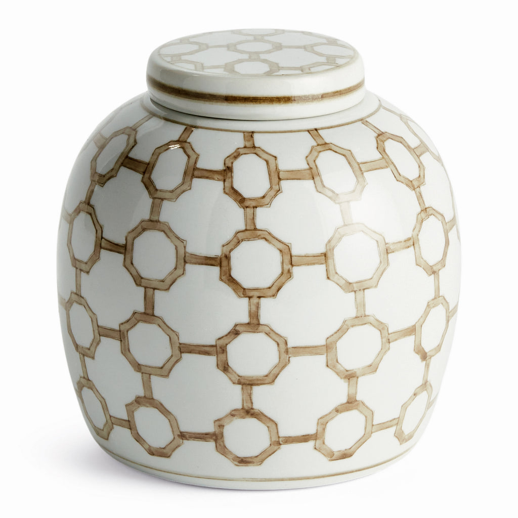 A classic chinoiserie-inspired link pattern in taupe and white. In design, taupe is often associated with muted, sophisticated qualities. It evokes balance and timelessness. A tone that plays well in any palette, and is an inspired design choice for this lidded jar. It is a welcome addition to the well-appointed bookshelf, mantel or entry console.