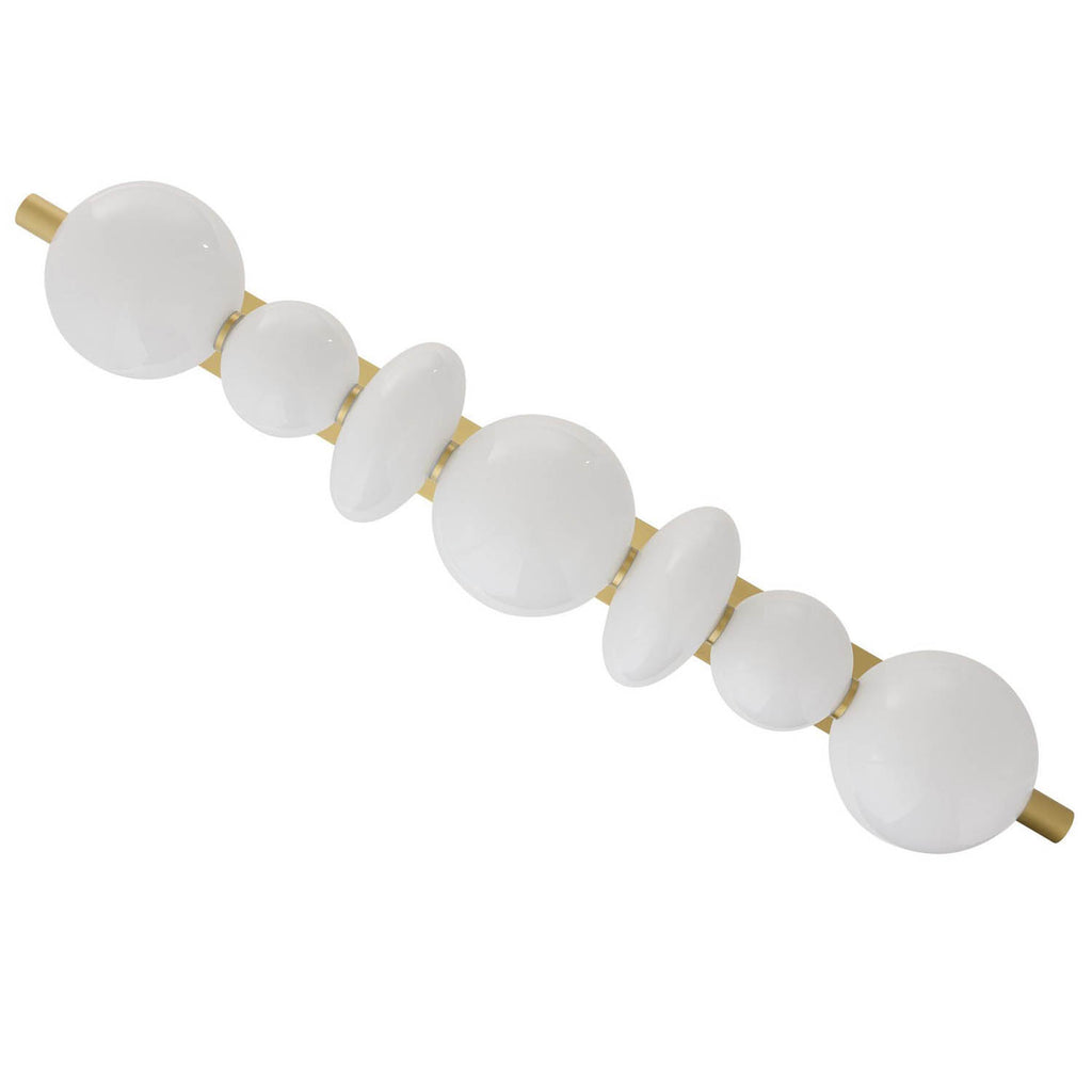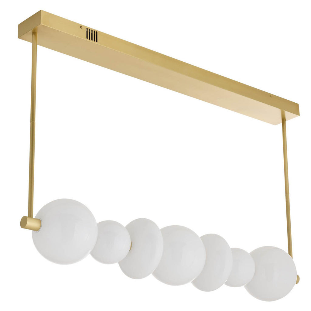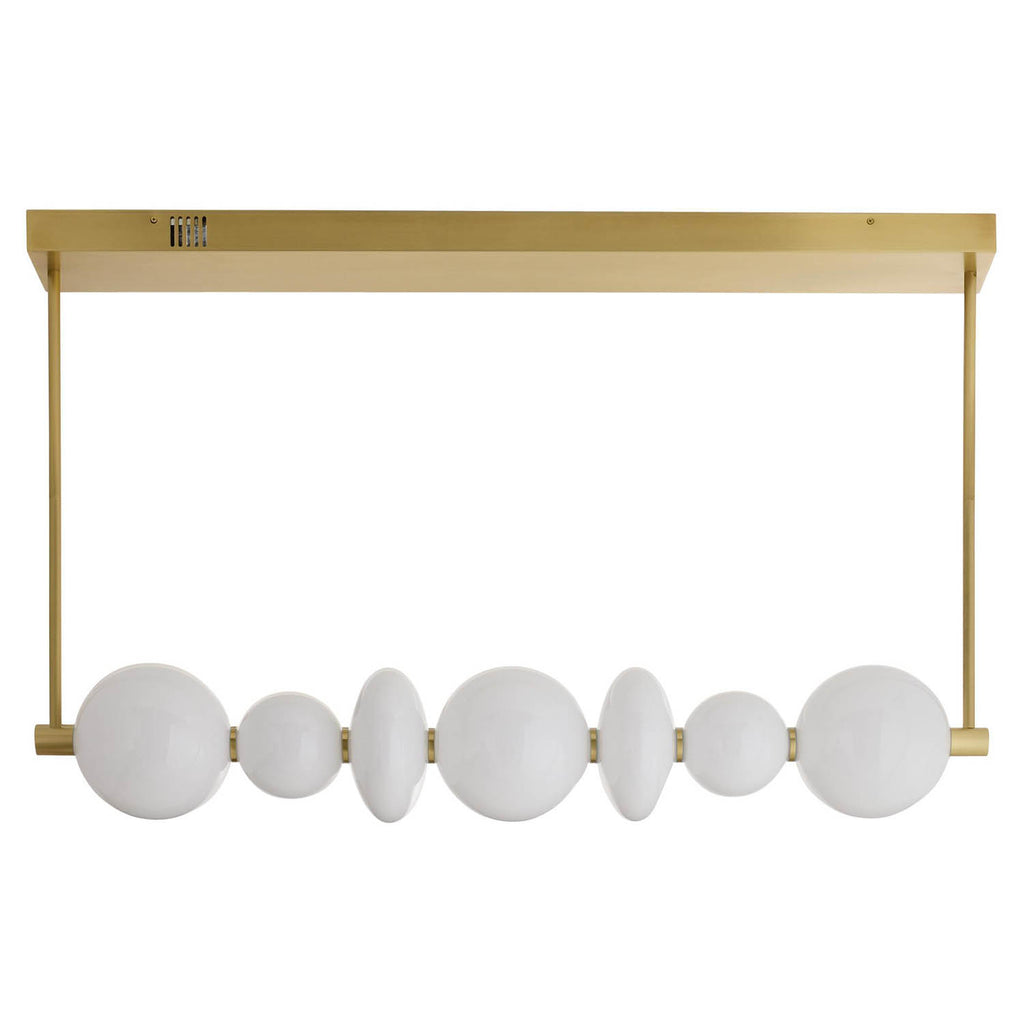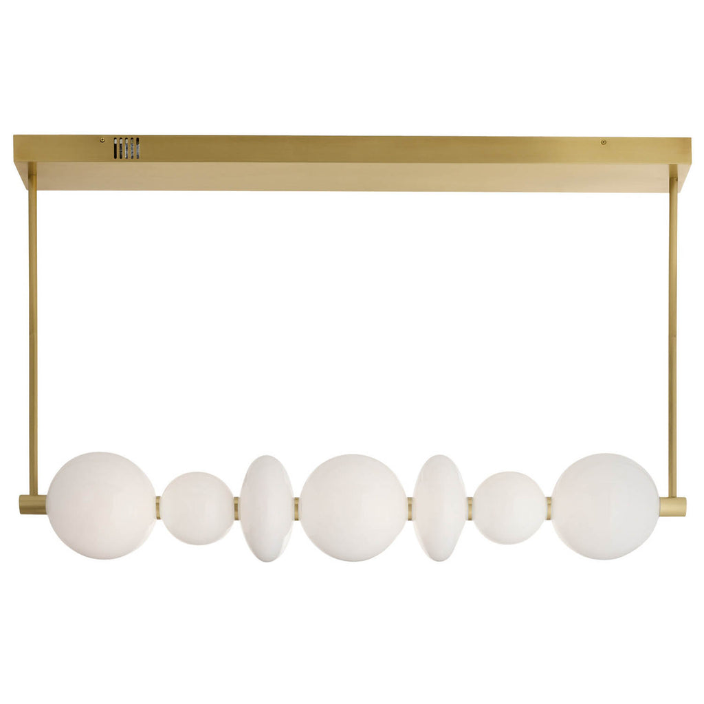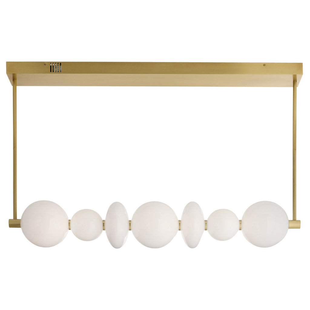 The Raphael chandelier features artfully lined opal glass beads strung along a linear antique-brass-plated steel frame with integrated LED lighting and white acrylic diffuser. Damp-rated; finish will vary.