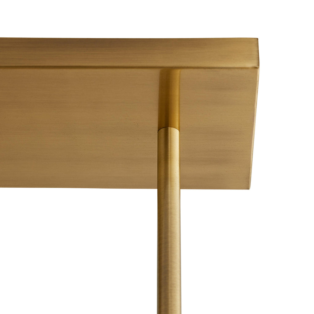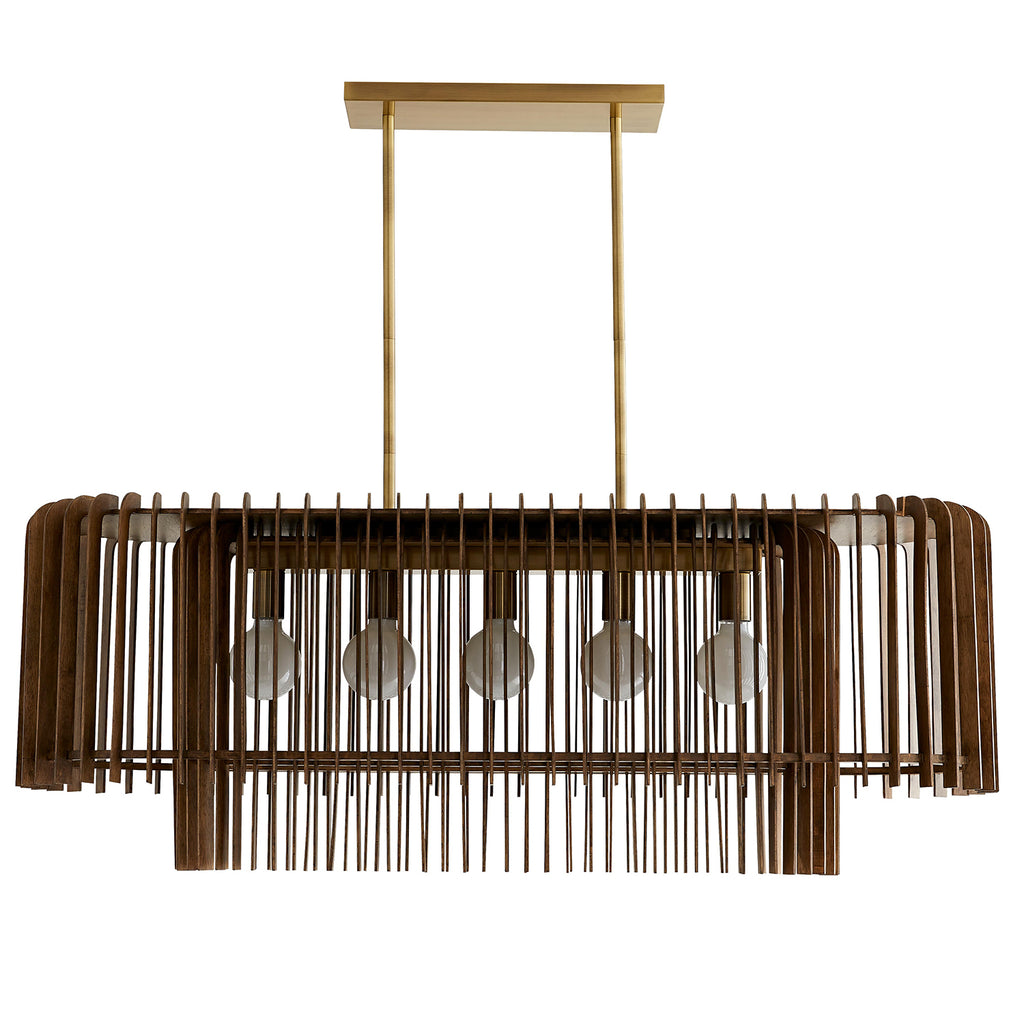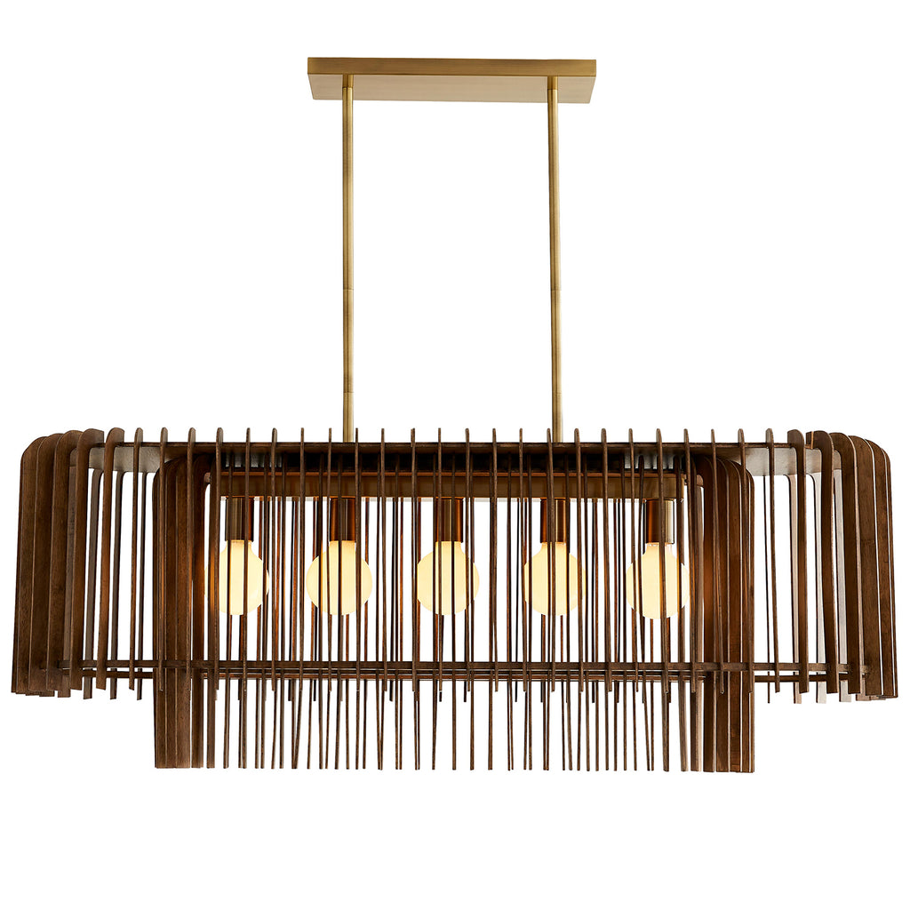 A statement chandelier featuring two tiers of dark walnut wooden slats radiating over five glass globes, all supported by a refined antique brass frame—additional pipe available. Finish will vary.