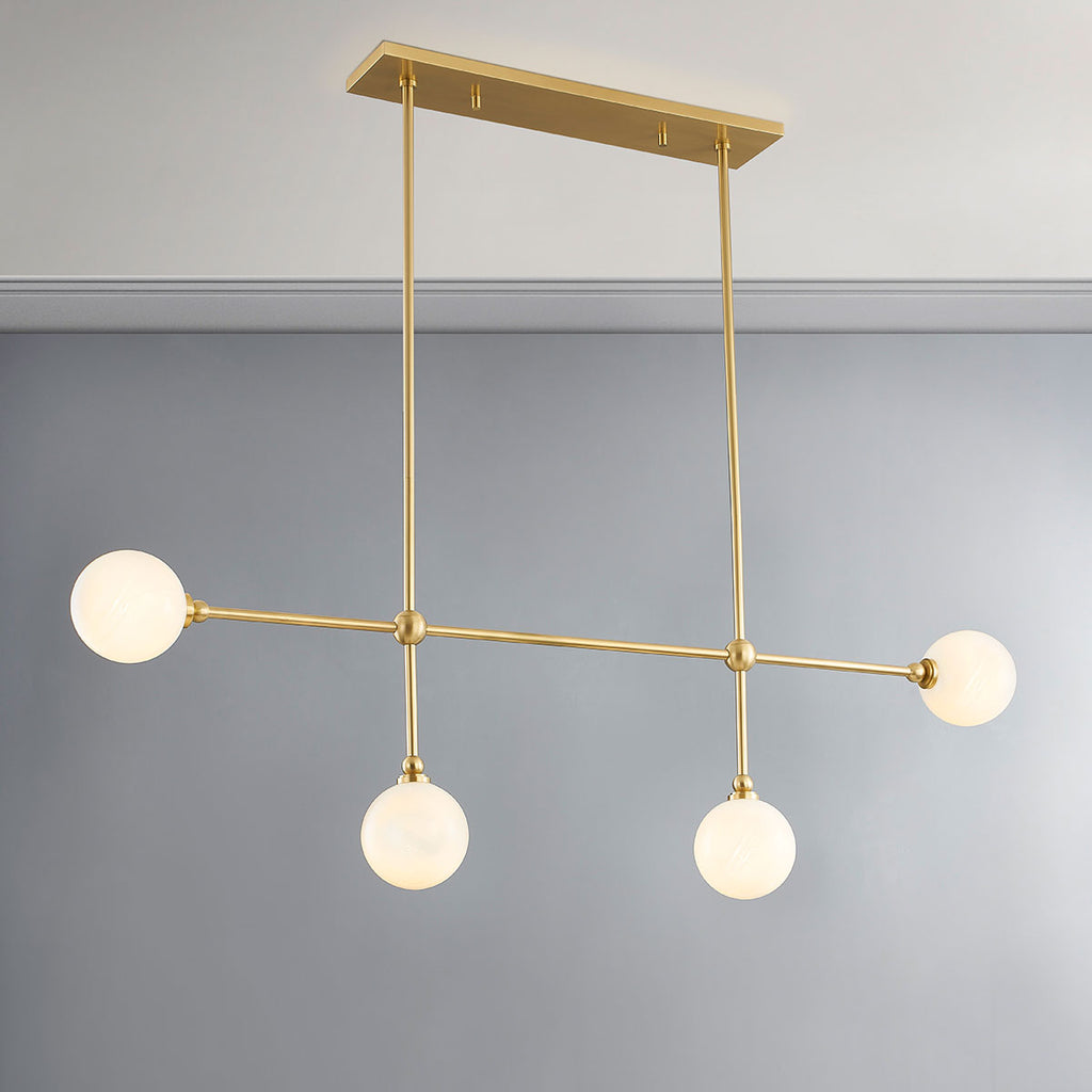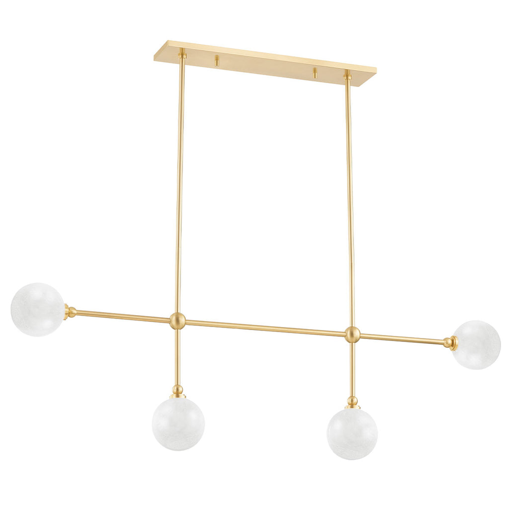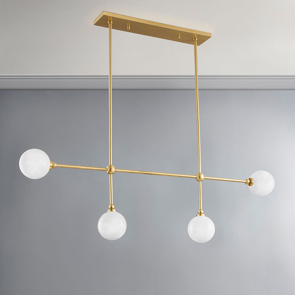 Renowned for built-to-last quality with a timeless feel, Hudson Valley offers a modern lighting collection with elegant touches, recalling vintage inspiration. The Hudson Valley Andrews linear island light features cloud etched glass globes cap slender baton-like Aged Brass arms, adorned with matching metal orbs, to create a streamlined modern design. As the name suggests, the cloud etched glass creates a wispy cloud-like pattern inside the glass globe shades that fills with a warm glow when lit. The sconce is also available in a Polished Nickel making it a good choice for the bath.