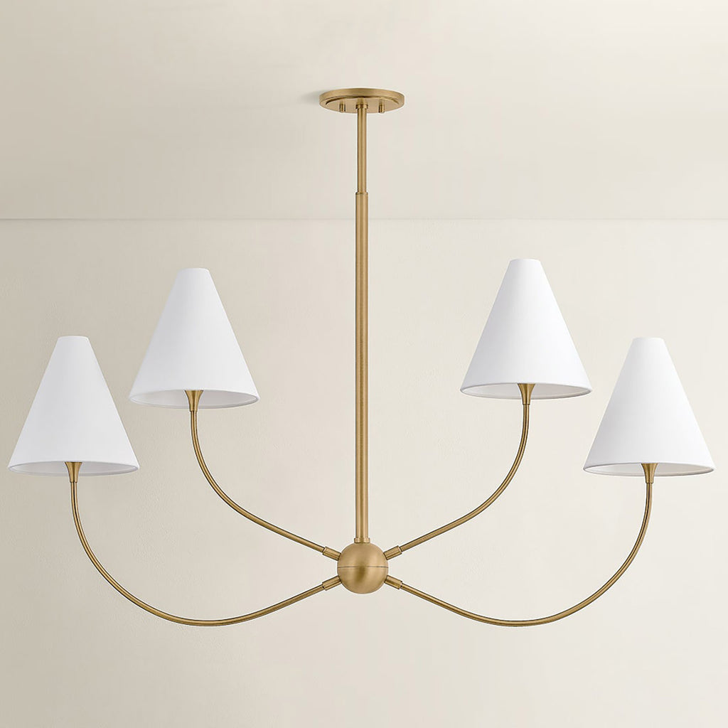 A nature-inspired take on timeless silhouettes, Lauren Liess x Troy Lighting Evermore is defined by its airy, voluminous shape, graceful arcing arms, and petite off-white linen shades. Each fixture appears to reach upward—evoking the gentle growth of wild mushrooms. A Patina Brass finish adds warmth and vintage polish. Available as a 1-light sconce, 6- and 10-light chandeliers, and a 4-light linear, Evermore is a sculptural lighting fantasy for the modern home.