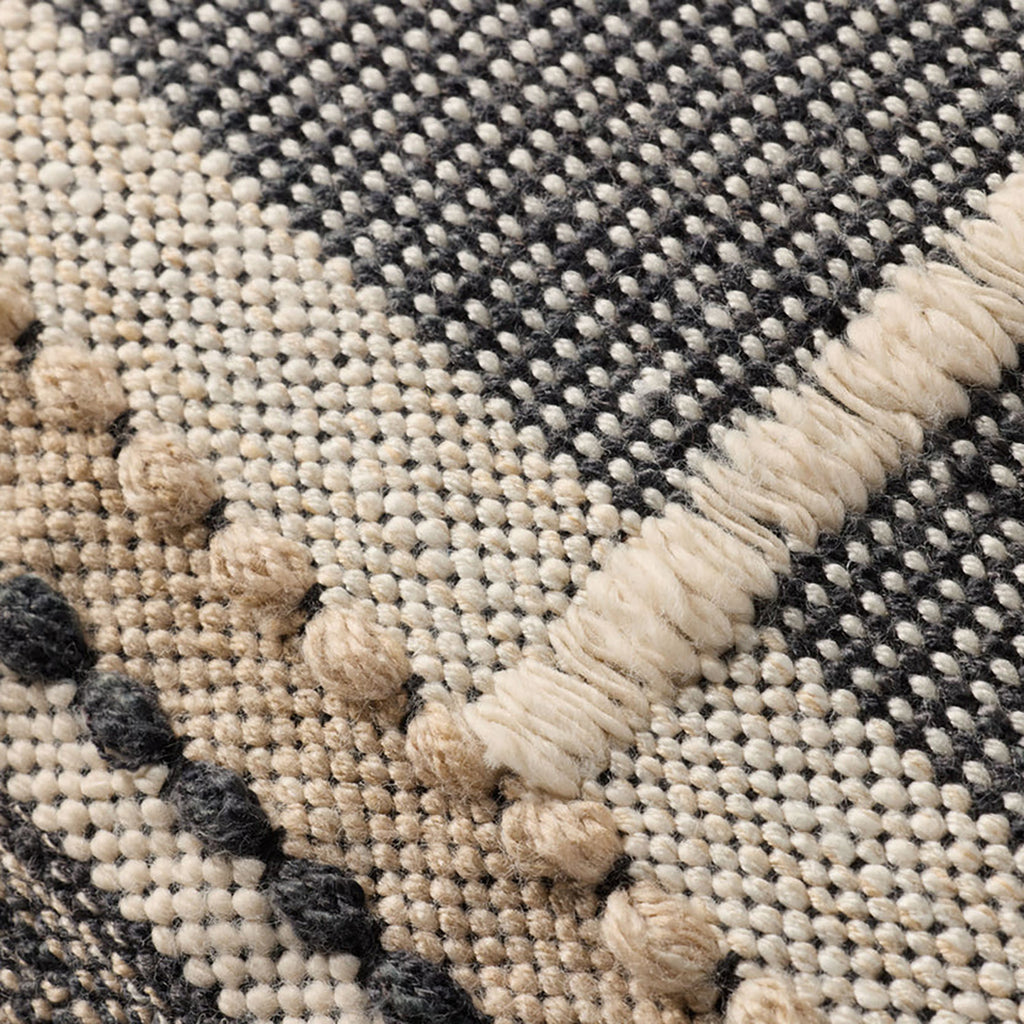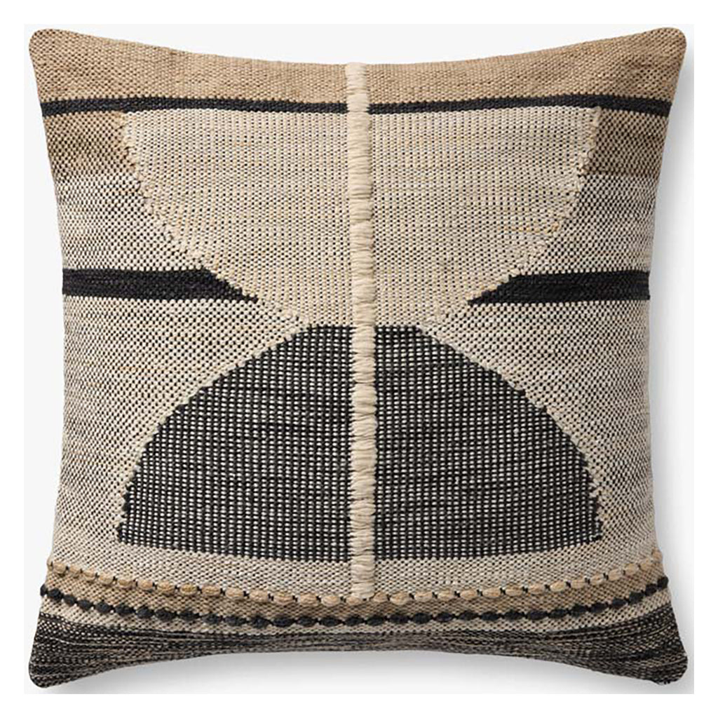 This indoor/outdoor throw pillow has a patchwork geometric design in a black, natural, and tan color palette for bohemian, farmhouse, or traditional home decor. The 22in x 22in square pillow is hand-loomed in India of soft yet durable polyester.