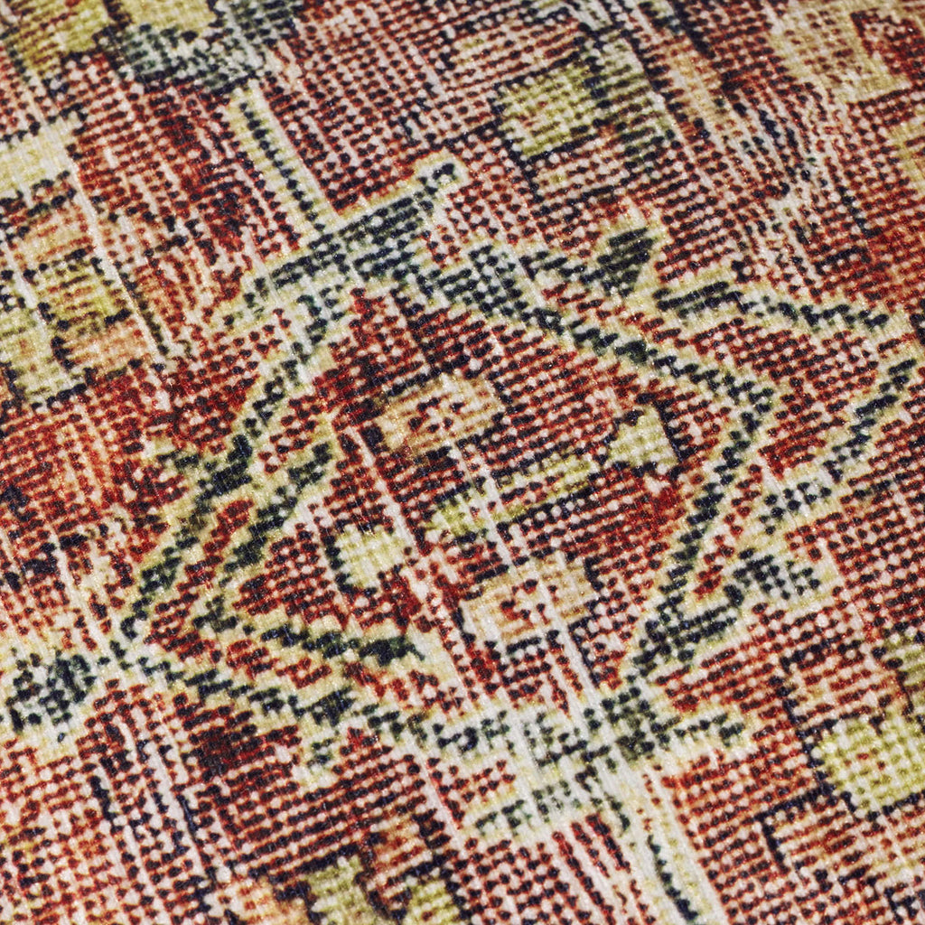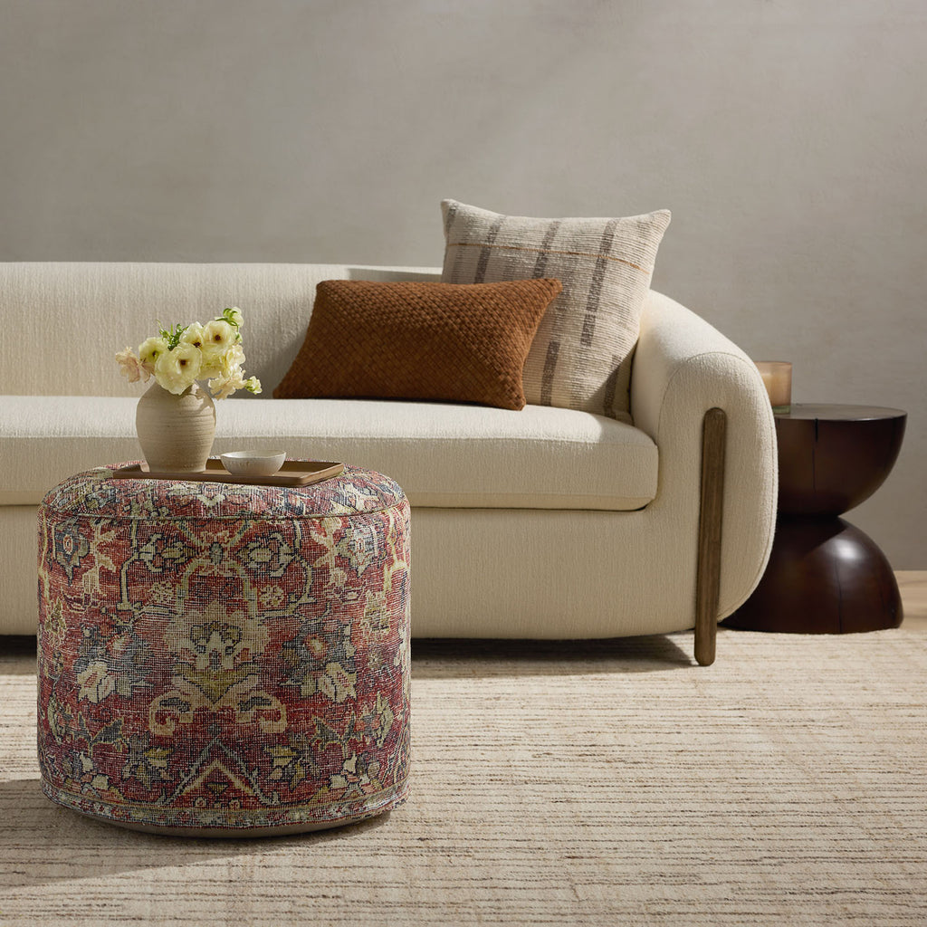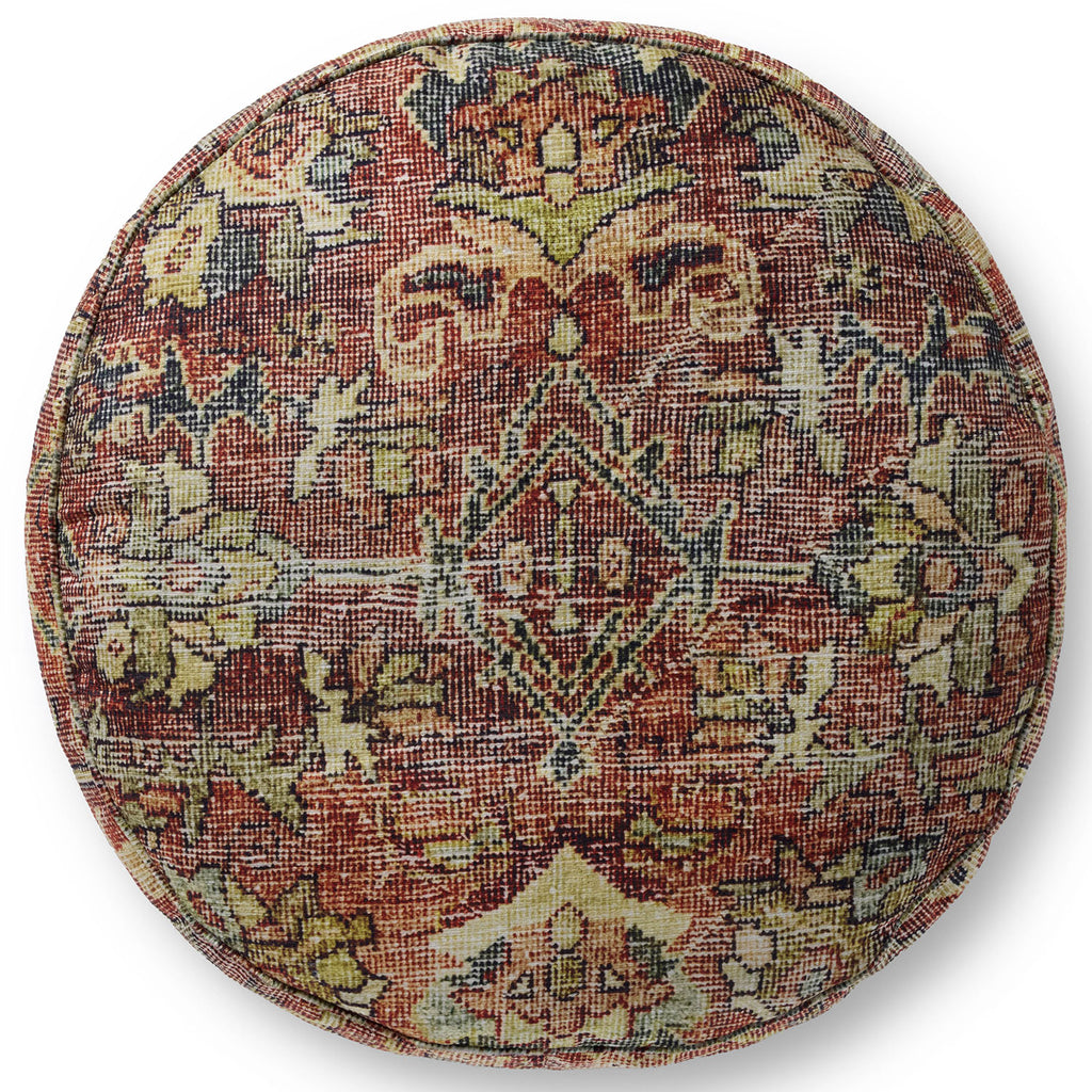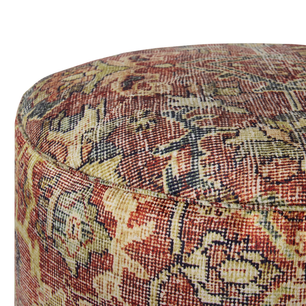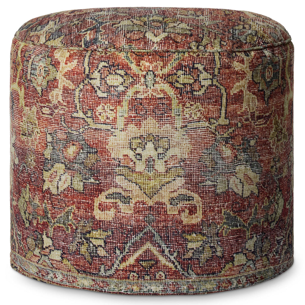 This spice red-toned pouf with a traditional, vintage-inspired design can be used as an accent, an ottoman, or extra seating in your living room or bedroom. The pouf measures 18"W x 18"D x 20"H and is machine-woven of easy-to-clean polyester.