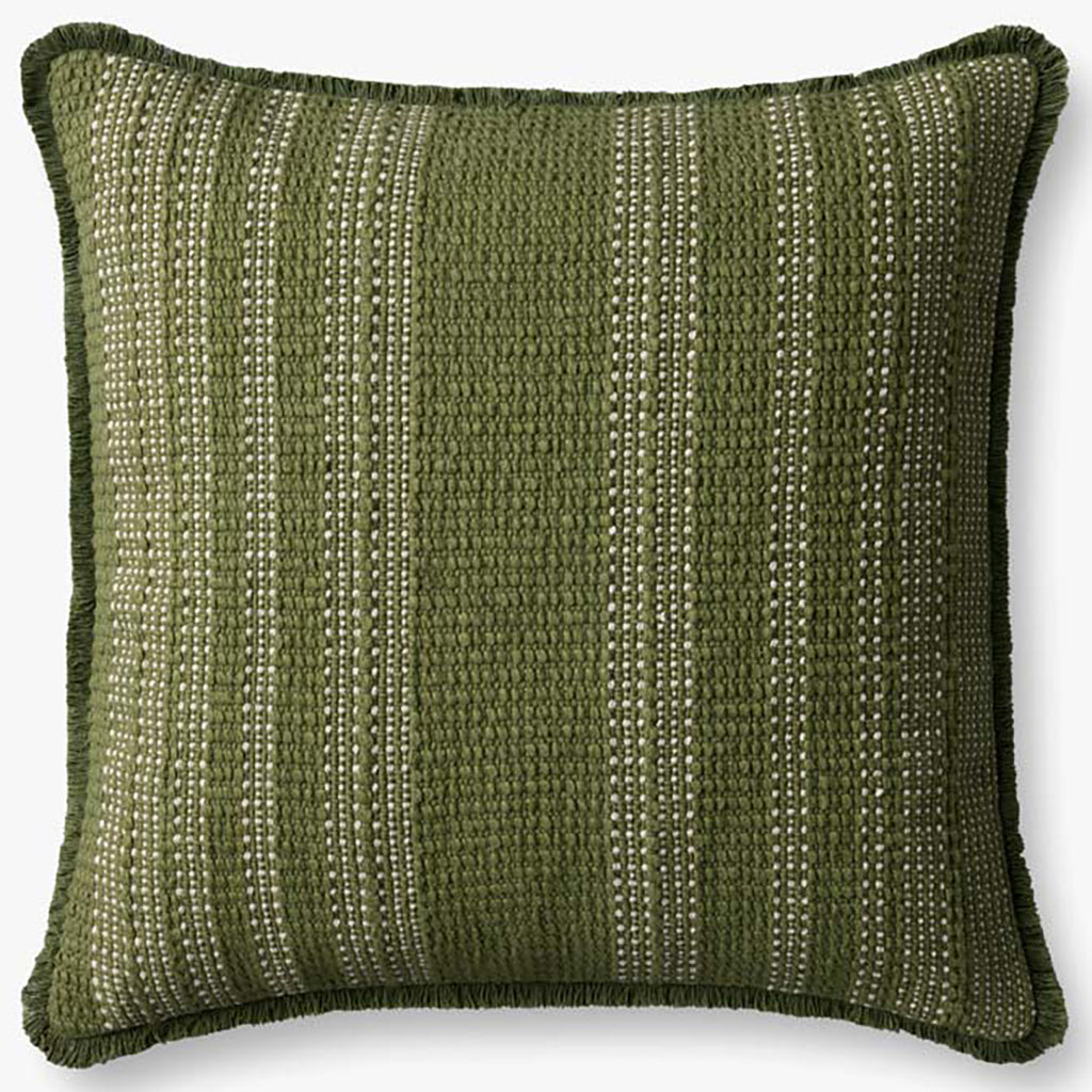 This woven throw pillow features ivory stitched stripes against a dusky background, trimmed with short fringe. The pillow cover is made of 100% cotton and measures 20” x 20”, a standard size to style in living rooms and bedrooms.