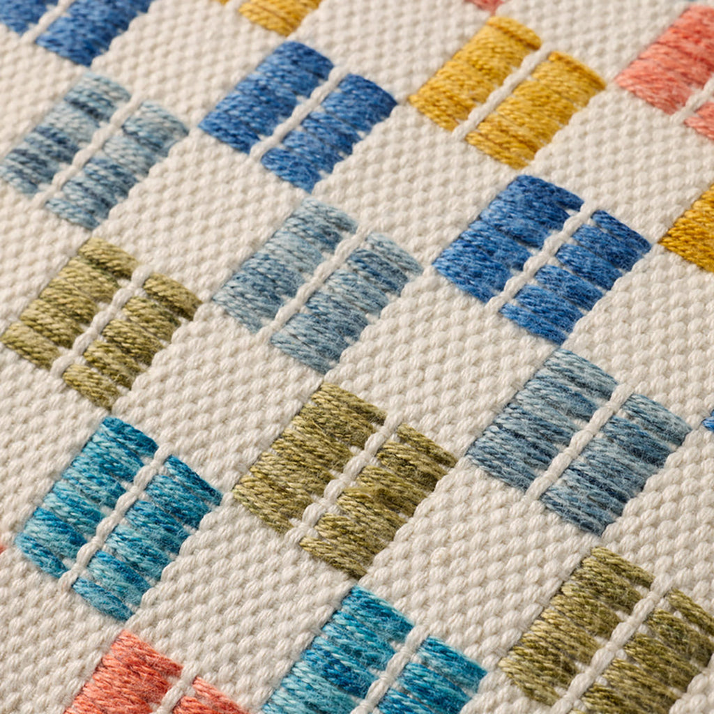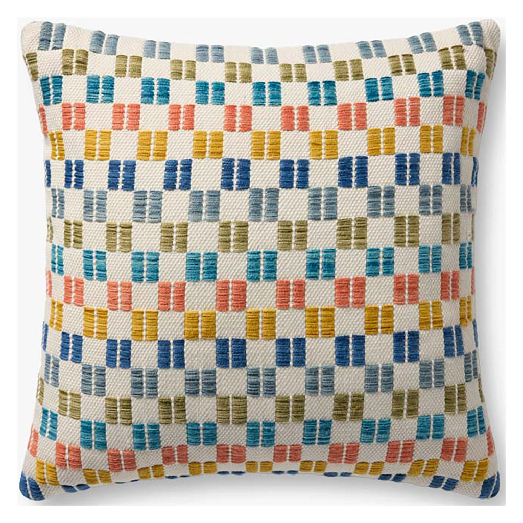 This colorful indoor/outdoor throw pillow features a geometric design with raised embroidered details, a playful accent in living rooms and on patios and porches. The 13in x 21in lumbar pillow is hand-loomed in India of soft yet durable polyester.