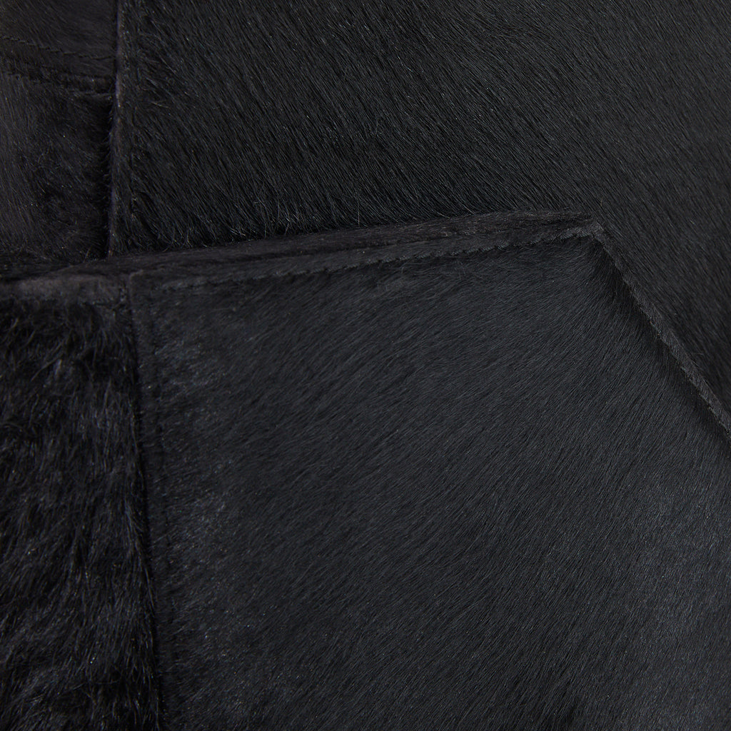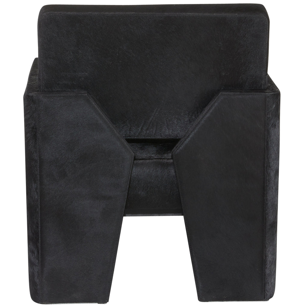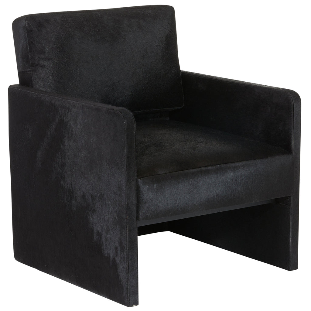 Bringing back the best of 1990s-influenced style, this handsome black hair-on-hide style was designed to please from every angle in a room. As attractive from the back as when seen head on, its precise lines are enhanced with a cinched hourglass back. Squared arms and a well-padded seat complete the silhouette. Hide will vary.